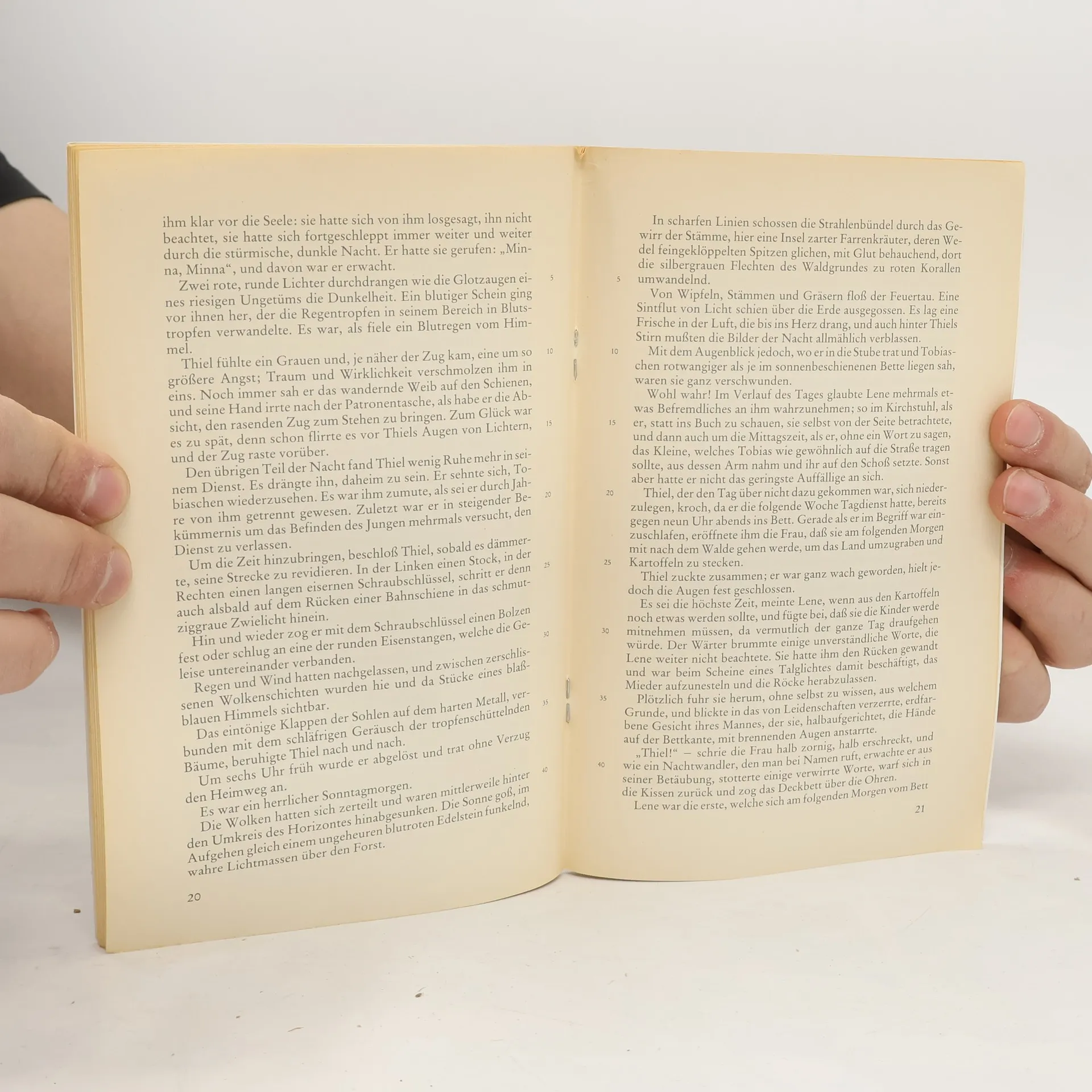 Der Bahnwärter Thiel lebt glücklich mit seiner Frau und seinem Sohn Tobias zusammen und führt seinen Dienst stets pflichtbewusst und zuverlässig aus. Als seine Frau stirbt, heiratet er die dominante und herrische Magd Lene, mit der er ein Kind bekommt. Lene misshandelt Tobias, und Thiel sieht in einer Wahnvorstellung bereits seine erste Frau mit einem blutigen Bündel über die Gleise fliehen. Einige Zeit später stirbt Tobias durch Lenes Schuld auf den Gleisen. Nachts erschlägt der Bahnwärter Thiel schliesslich Lene und sein Kind aus zweiter Ehe und wird in ein Irrenhaus gebracht. Mit Bahnwärter Thiel schrieb Hauptmann eine psychologische Studie, in der er realistisch den Verfall eines Menschen vom pflichtbewussten Kirchgänger zum Mörder schildert. Tiefe verleihen der „novellistischen Studie“, wie der Untertitel des Werks heisst, auch die zahlreichen Symbole und Vorausdeutungen. Als Hauptmann die Erzählung 1887 schrieb, war er knapp 25 Jahre alt. Inzwischen ist „Bahnwärter Thiel“ der bekannteste Prosatext des Nobelpreisträgers.
