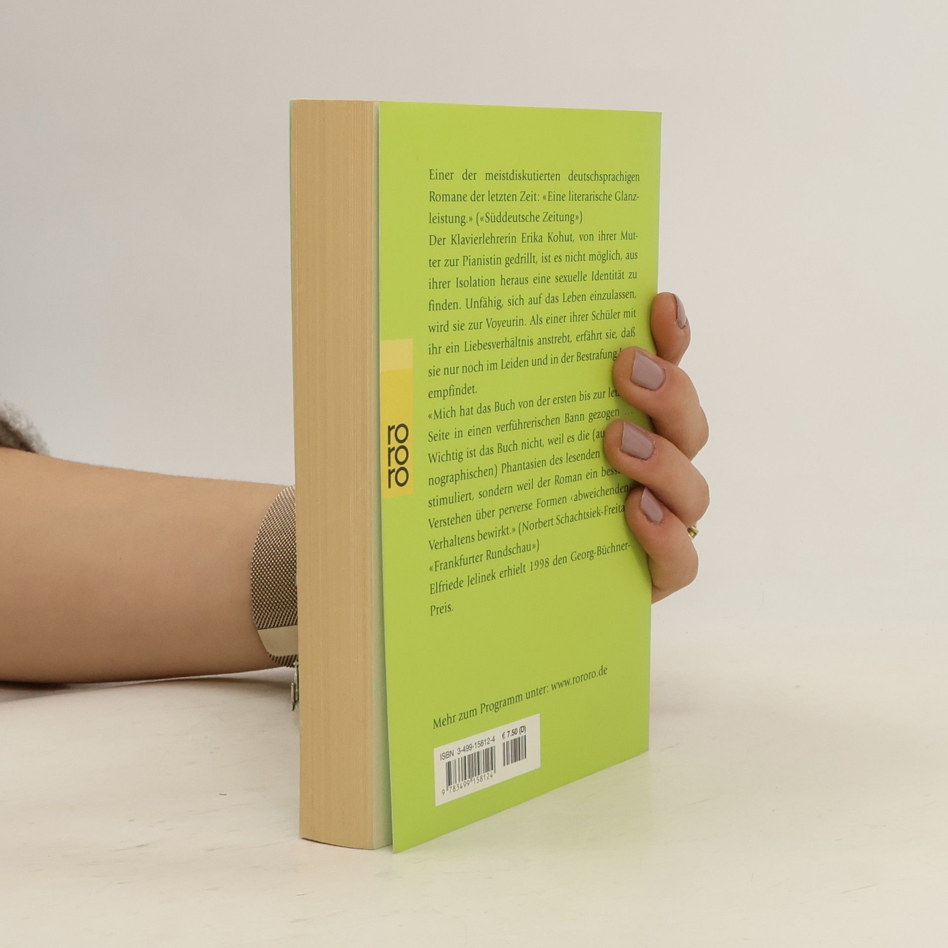 «Eine literarische Glanzleistung.» (Süddeutsche Zeitung)Von ihrer Mutter wurde sie unerbittlich zur Pianistin gedrillt. Und nun findet die Klavierlehrerin Erika Kohut nicht mehr aus der Isolation heraus. Unfähig, sich auf das Leben einzulassen, wird sie zur Voyeurin. Als einer ihrer Schüler ein Liebesverhältnis mit ihr anstrebt, erkennt sie, dass sie nur noch im Leiden und in der Bestrafung Lust empfindet.«Die Klavierspielerin» brachte Elfriede Jelinek den endgültigen Durchbruch. Michael Hanekes Verfilmung triumphierte auf dem Filmfestival 2001 in Cannes: Grand Prix der Jury und Darstellerpreise für Isabelle Huppert und Benoît Magimel. Die Autorin wurde für ihr Werk im Jahr 2004 mit dem Nobelpreis für Literatur ausgezeichnet.