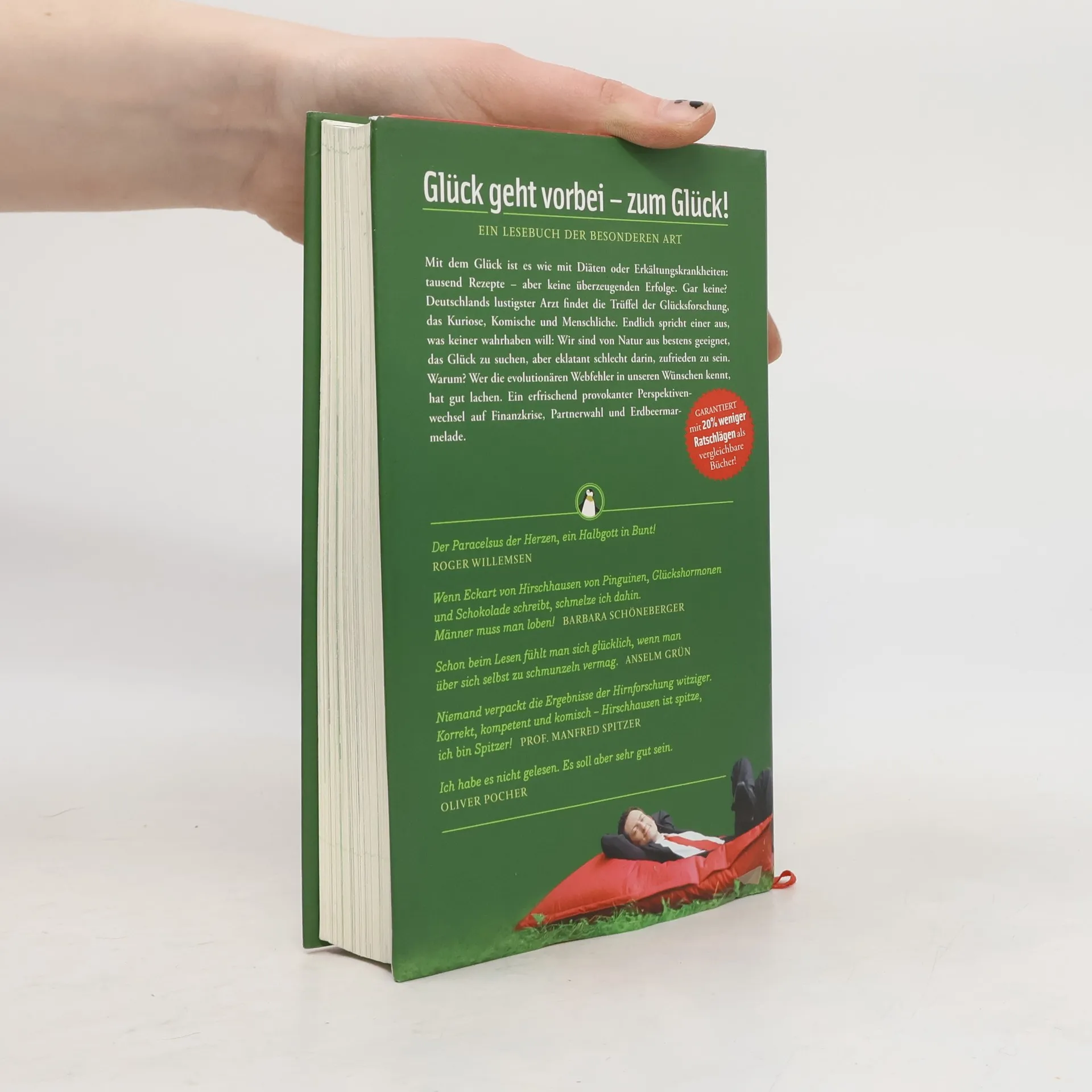 Glück geht vorbei - zum Glück!Mit dem Glück ist es wie mit Diäten oder Erkältungskrankheiten: tausend Rezepte - aber keine überzeugenden Erfolge. Gar keine? Deutschlands lustigster Arzt findet die Trüffel der Glücksforschung, das Kuriose, Komische und Menschliche. Endlich spricht einer aus, was keiner wahrhaben will: Wir sind von Natur aus bestens geeignet, das Glück zu suchen, aber eklatant schlecht darin, zufrieden zu sein. Warum? Wer die evolutionären Webfehler in unseren Wünschen kennt, hat gut lachen. Ein erfrischen provokanter Perpektivenwechsel auf Finanzkrise, Partnerwahl und Erdbeermarmelade.