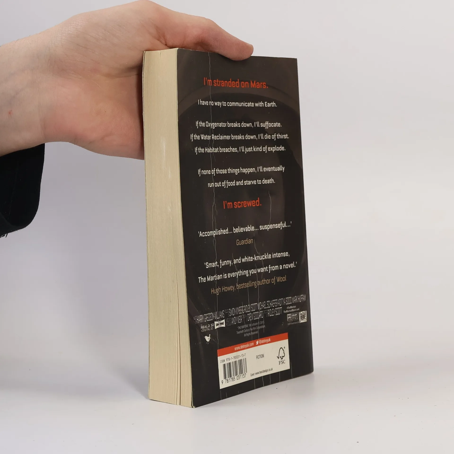 The Sunday Times Bestseller behind the major new film from Ridley Scott starring Matt Damon and Jessica Chastain. I'm stranded on Mars. I have no way to communicate with Earth. I'm in a Habitat designed to last 31 days. If the Oxygenator breaks down, I'll suffocate. If the Water Reclaimer breaks down, I'll die of thirst. If the Hab breaches, I'll just kind of explode. If none of those things happen, I'll eventually run out of food and starve to death. So yeah. I'm screwed.