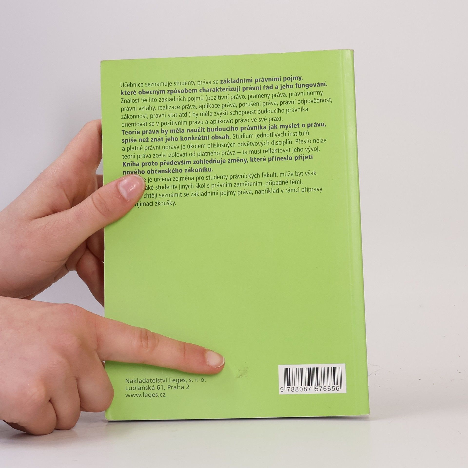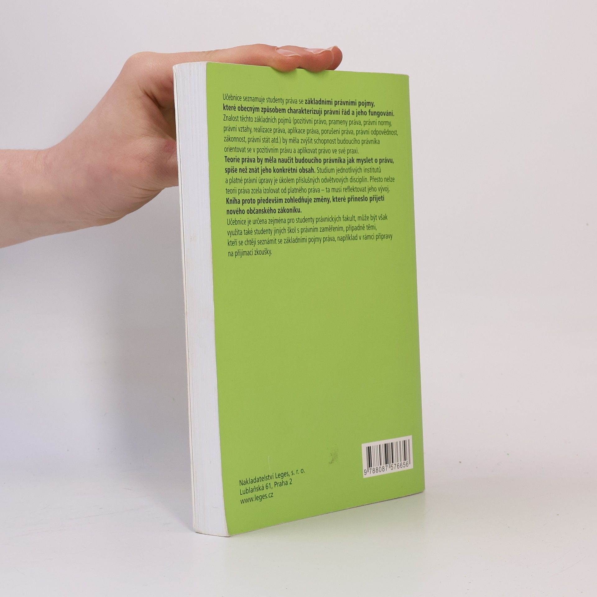 Učebnice seznamuje studenty práva se základními právními pojmy, které obecným způsobem charakterizují právní řád a jeho fungování. Znalost těchto základních pojmů (pozitivní právo, prameny práva, právní normy, právní vztahy, realizace práva, aplikace práva, porušení práva, právní odpovědnost, zákonnost, právní stát atd.) by měla zvýšit schopnost budoucího právníka orientovat se v pozitivním právu a aplikovat právo ve své praxi. Teorie práva by měla naučit budoucího právníka jak myslet o právu, spíše než znát jeho konkrétní obsah. Studium jednotlivých institutů a platné právní úpravy je úkolem příslušných odvětvových disciplín. Přesto nelze teorii práva zcela izolovat od platného práva – ta musí reflektovat jeho vývoj. Kniha proto především zohledňuje změny, které přineslo přijetí nového občanského zákoníku. Učebnice je určena zejména pro studenty právnických fakult, může být však využita také studenty jiných škol s právním zaměřením, případně těmi, kteří se chtějí seznámit se základními pojmy práva, například v rámci přípravy na přijímací zkoušky.