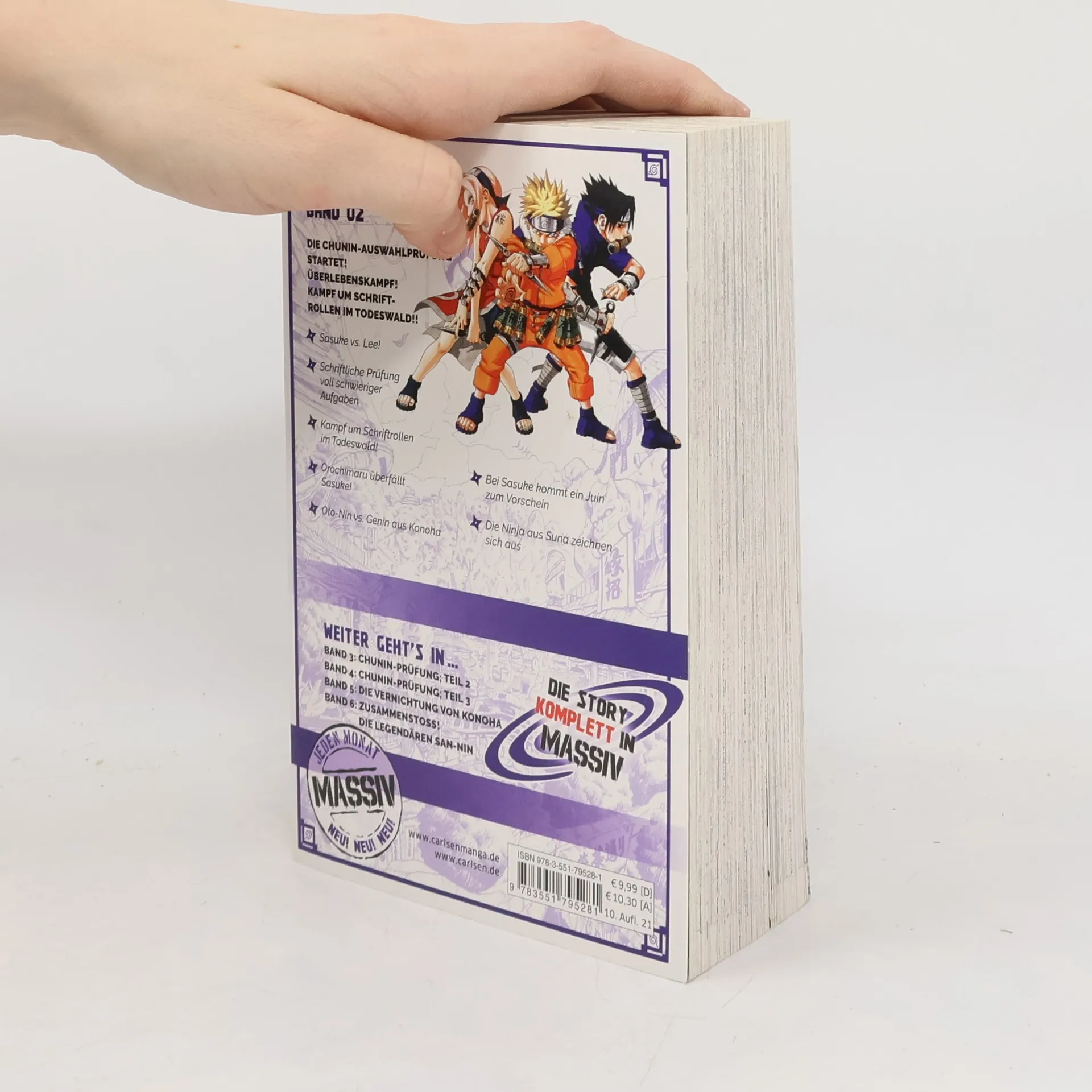 Erlebe atemberaubende Abenteuer und Ninja-Action mit NARUTO! Jetzt als tolle Sammelbandedition mit insgesamt 24 Bänden im größeren Format und neuen Covermotiven! Naruto ist kein »Tunichtgut« in Konohagakure mehr; er ist ein Ge-Nin geworden. Für seinen Traum, »Hokage« zu werden, an der Spitze aller Ninja des Dorfes zu stehen, trainiert er tagtäglich. Er stellt sich der Chu-Nin-Prüfung und bleibt unerschütterlich seinem Ninja-Weg treu! Band 2 der Naruto-Massiv Reihe enthält die Kapitel 34 - 64. Für Fans von One Piece, My Hero Academia, Demon Slayer, Jujutsu Kaisen, Dragon Ball, Dr. Stone und Fairy Tail! Massiv-Highlights in Band 2: Die Chu-Nin-Auswahlprüfung startet! Überlebenskampf! Kampf um Schrift-Rollen im Todeswald! - Sasuke vs. Lee! - Schriftliche Prüfung voll schwieriger Aufgaben - Kampf um Schriftrollen im Todeswald! - Orochimaru überfällt Sasuke! - Oto-Nin vs. Genin aus Konoha - Bei Sasuke kommt ein Juin zum Vorschein - Die Ninja aus Suna zeichnen sich aus