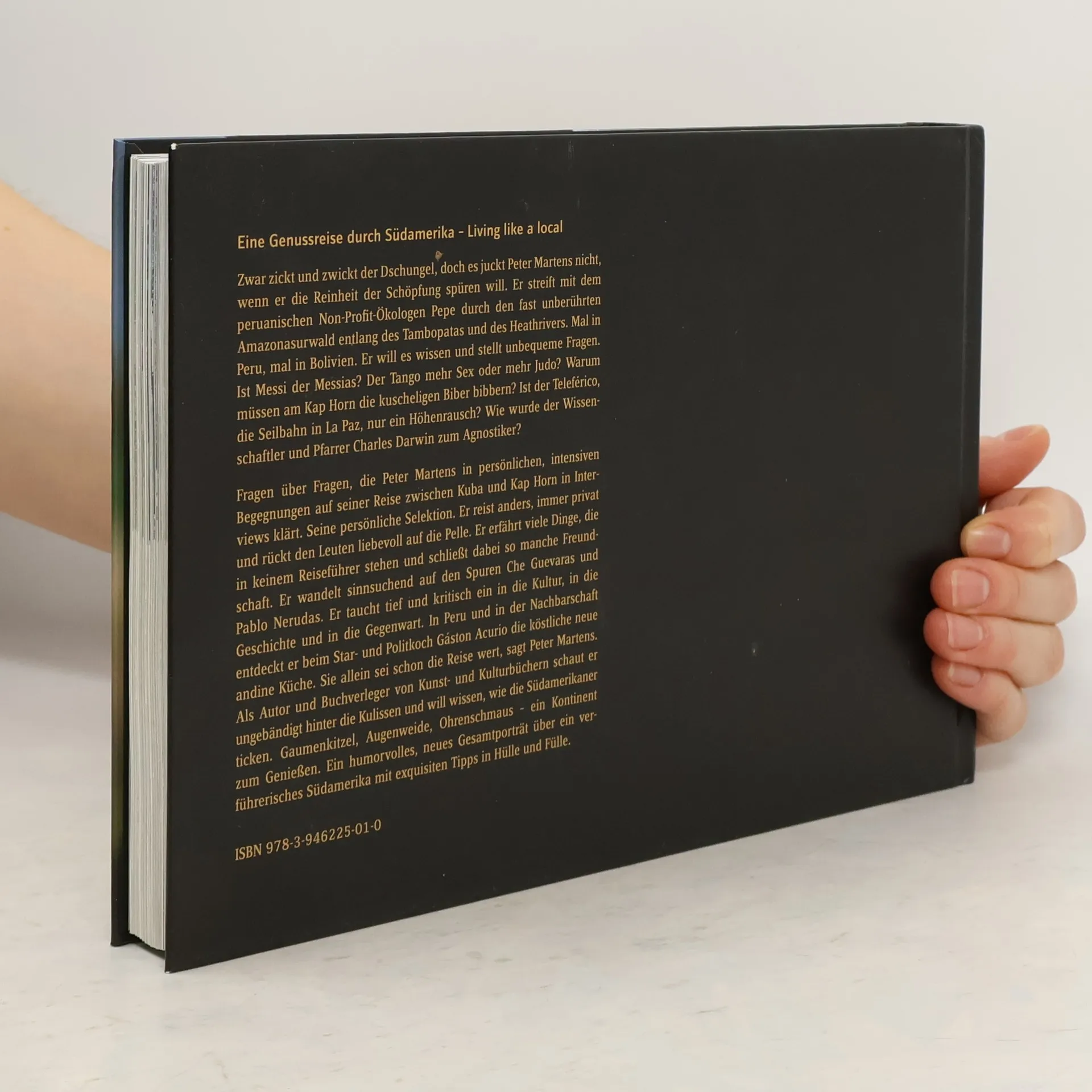 Eine kulturpolitische Reise durch Südamerika – Living like a local. Der südbadische Autor und Verleger Peter Martens lässt sich von der Natur des Amazonasurwalds zwischen Peru und Bolivien inspirieren, während er mit dem peruanischen Ökologen Pepe unterwegs ist. Unbequeme Fragen begleiten seine Erlebnisse: Ist Messi der Messias? Ist Tango mehr Sex oder mehr Judo? Warum bibbern die Biber am Kap Horn? Was ist der Teleférico in La Paz wirklich? Martens sucht in persönlichen Interviews Antworten und geht dabei auf Tuchfühlung mit den Menschen. Er entdeckt viele Geheimnisse, die in Reiseführern nicht zu finden sind, und schließt dabei Freundschaften. Auf den Spuren von Che Guevara und Pablo Neruda taucht er tief in die Kultur, Geschichte und Gegenwart ein. Besonders die neue andine Küche, die er beim Star- und Politkoch Gáston Acurio entdeckt, ist für ihn eine Reise wert. Als Autor und Buchverleger von Kunst- und Kulturbüchern blickt er hinter die Kulissen und erforscht, wie die Südamerikaner leben. Mit einem humorvollen Gesamtporträt und exquisiten Tipps zeigt Martens, dass dieser Kontinent ein Fest für alle Sinne ist.