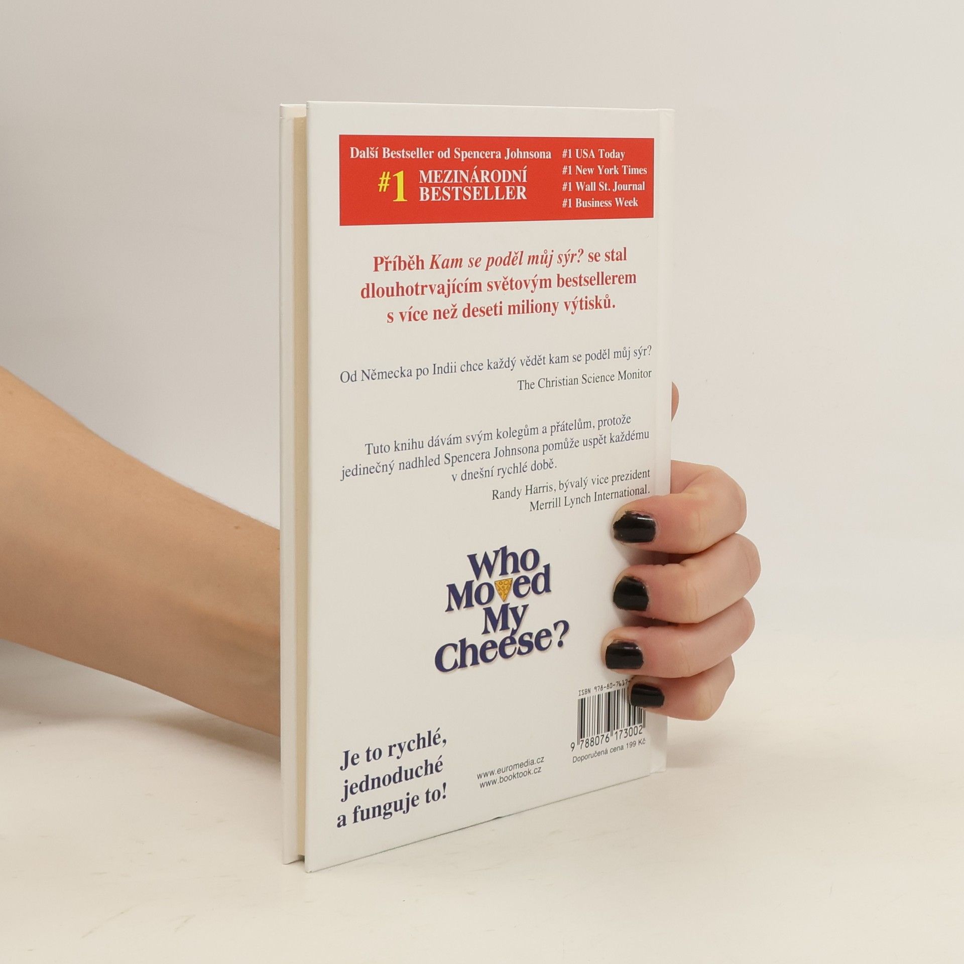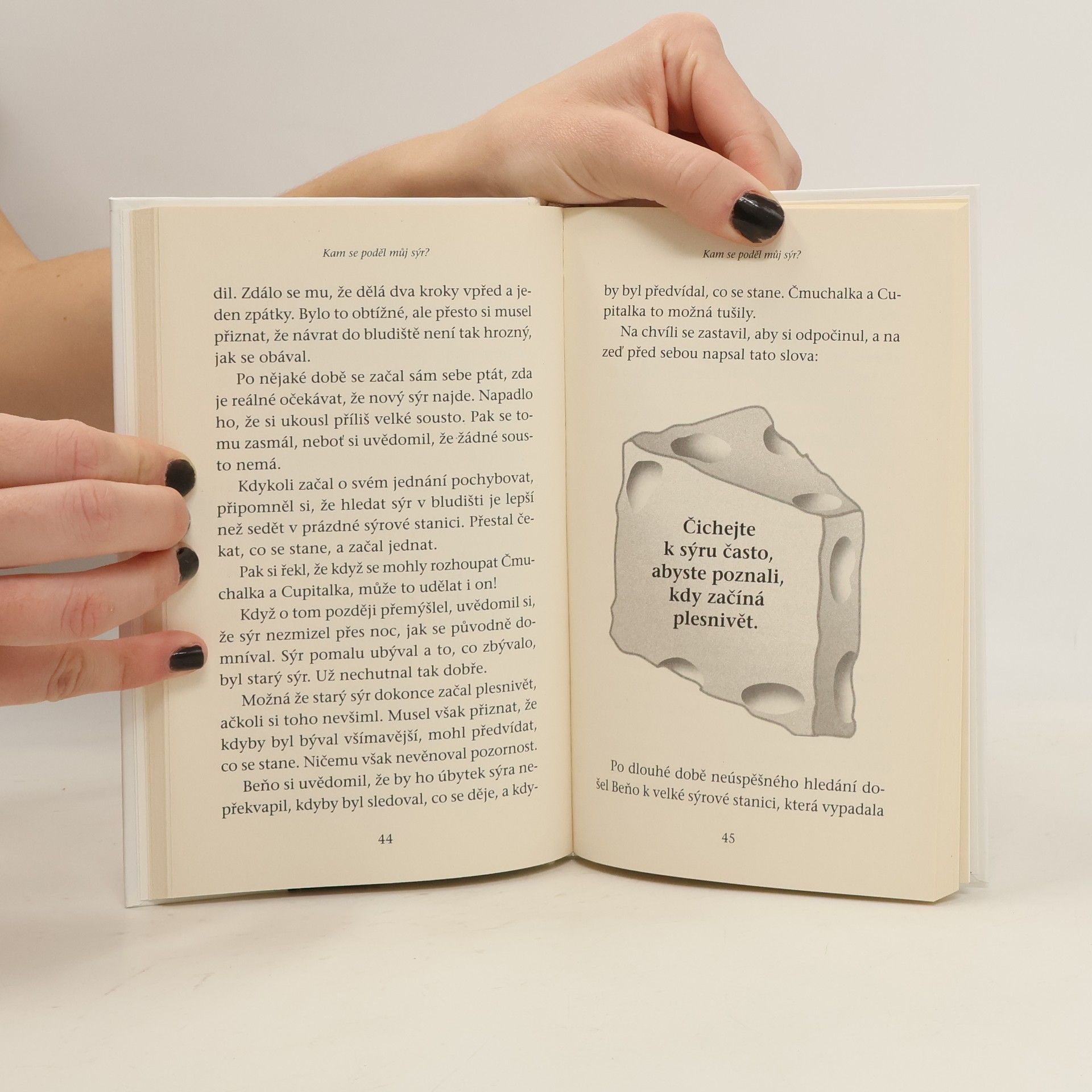 Zábavný a poučný příběh o čtyřech zajímavých postavičkách, které žijí v „Bludišti“, kde hledají „Sýr“. Sýr je metaforou toho, co v životě chceme, ať už je to zaměstnání, partnerský vztah, peníze, dům, svoboda, dobré zdraví, společenské uznání nebo duševní vyrovnanost. Bludiště je místo, kde hledáme to, co chceme. Postavičky v příběhu čelí náhlé změně. Jedna z nich se nakonec vyrovná se změnou úspěšně a napíše na zeď bludiště, co se naučila. Až uvidíte nápis na zdi, naučíte se přistupovat ke změnám novým způsobem, jenž zmírní stres ve vašem životě. Knihu můžete přečíst za hodinu, ale její hluboká moudrost vám zůstane na celý život.