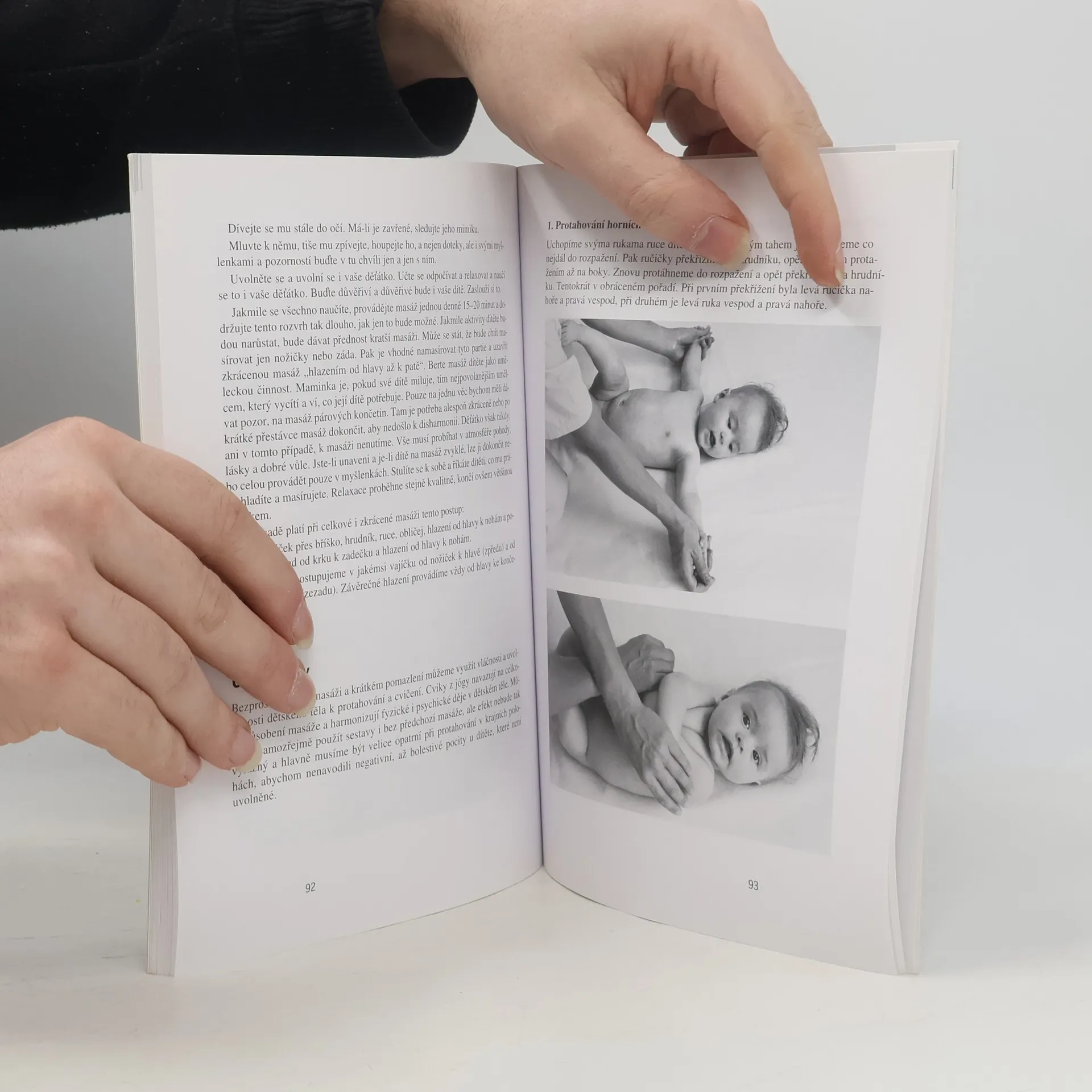 Postup při masáži, masáže jednotlivých částí těla, masáže v těhotenství a masáže novorozence, masáže u nemocných dětí. Názorné a přehledné uvedení do techniky masáží dětí a kojenců určené ať už pro výukové kurzy, pro profesionální pracovníky i pro samotné rodiče. Po teoretickém uvedení do problematiky masáží (účinnost masáží u zdravých i nemocných dětí, význam doteku jako součásti komunikace s dítětem, souvislosti a aroma- a muzikoterapií...) tvoří jádro knihy vlastní technika masáže, jež je ilustrována na cca. 75 fotografiích, které zájemcům pomohou osvojit si vlastní postup.