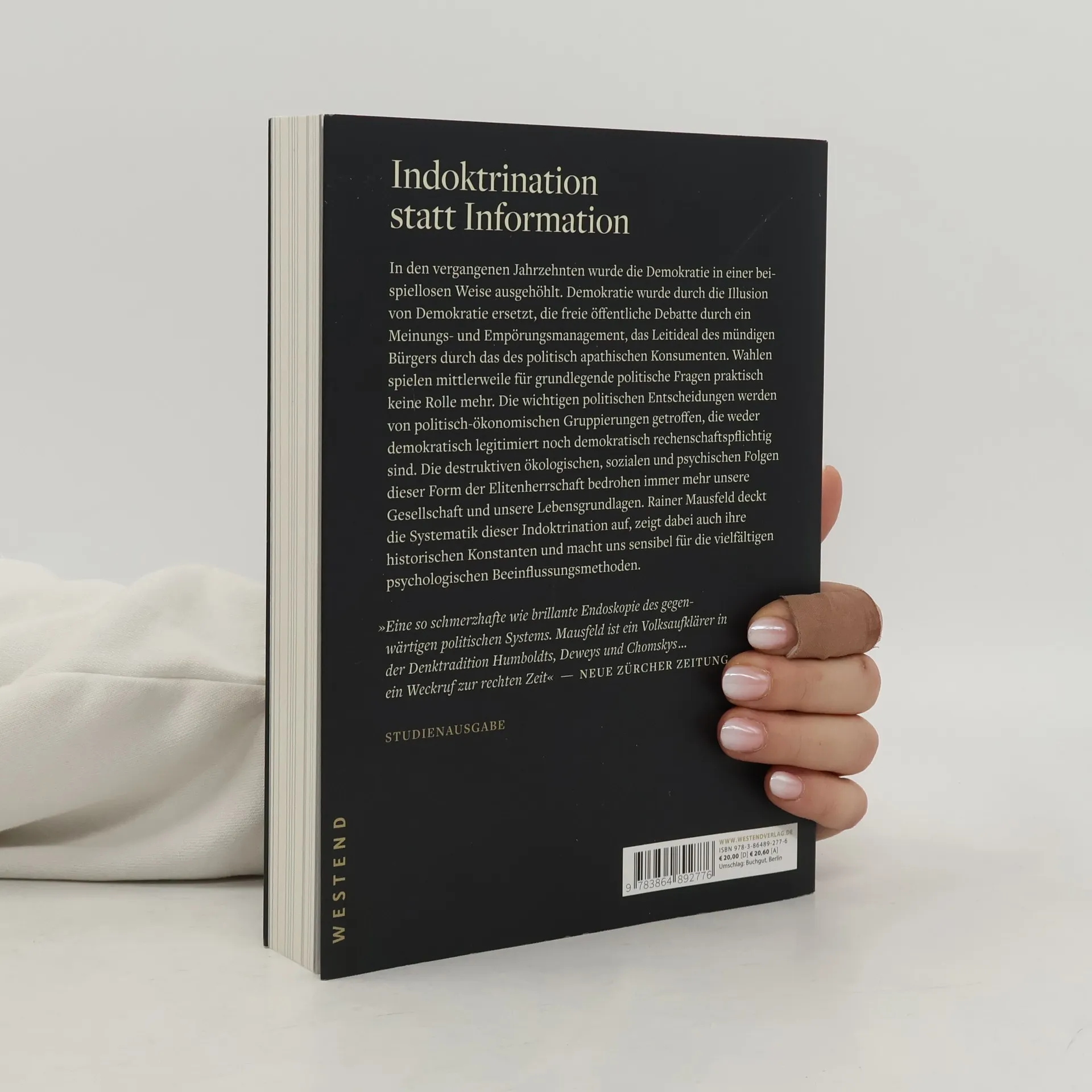 Um ein Nachwort von Rainer Mausfeld erweiterte Studienausgabe: In den vergangenen Jahrzehnten wurde die Demokratie in einer beispiellosen Weise ausgehöhlt. Demokratie wurde durch die Illusion von Demokratie ersetzt, die freie öffentliche Debatte durch ein Meinungs- und Empörungsmanagement, das Leitideal des mündigen Bürgers durch das des politisch apathischen Konsumenten. Wahlen spielen mittlerweile für grundlegende politische Fragen praktisch keine Rolle mehr. Die wichtigen politischen Entscheidungen werden von politisch-ökonomischen Gruppierungen getroffen, die weder demokratisch legitimiert noch demokratisch rechenschaftspflichtig sind. Die destruktiven ökologischen, sozialen und psychischen Folgen dieser Form der Elitenherrschaft bedrohen immer mehr unsere Gesellschaft und unsere Lebensgrundlagen. Rainer Mausfeld deckt die Systematik dieser Indoktrination auf, zeigt dabei auch ihre historischen Konstanten und macht uns sensibel für die vielfältigen psychologischen Beeinflussungsmethoden.