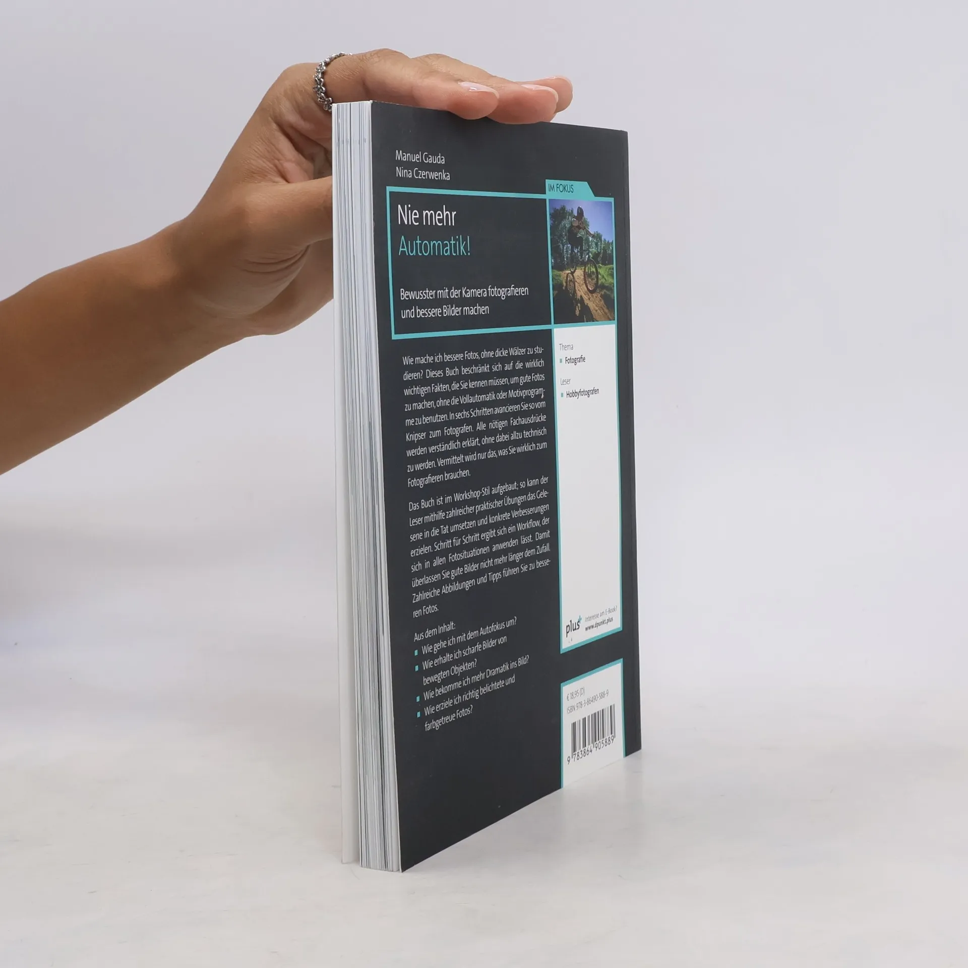 Wie mache ich bessere Fotos, ohne dicke Wälzer zu studieren? Dieses Buch beschränkt sich auf die wirklich wichtigen Fakten, die Sie kennen müssen, um gute Fotos zu machen, ohne die Vollautomatik oder Motivprogramme zu benutzen. In sechs Schritten avancieren Sie so vom Knipser zum Fotografen. Alle nötigen Fachausdrücke werden verständlich erklärt, ohne dabei allzu technisch zu werden. Vermittelt wird nur das, was Sie wirklich zum Fotografieren brauchen. Das Buch ist im Workshop-Stil aufgebaut; so kann der Leser mithilfe zahlreicher praktischer Übungen das Gelesene in die Tat umsetzen und konkrete Verbesserungen erzielen. Schritt für Schritt ergibt sich ein Workflow, der sich in allen Fotosituationen anwenden lässt. Damit überlassen Sie gute Bilder nicht mehr länger dem Zufall. Zahlreiche Abbildungen und Tipps führen Sie zu besseren Fotos. Aus dem Wie gehe ich mit dem Autofokus um? Wie erhalte ich scharfe Bilder von bewegten Objekten? Wie bekomme ich mehr Dramatik ins Bild? Wie erziele ich richtig belichtete und farbgetreue Fotos?