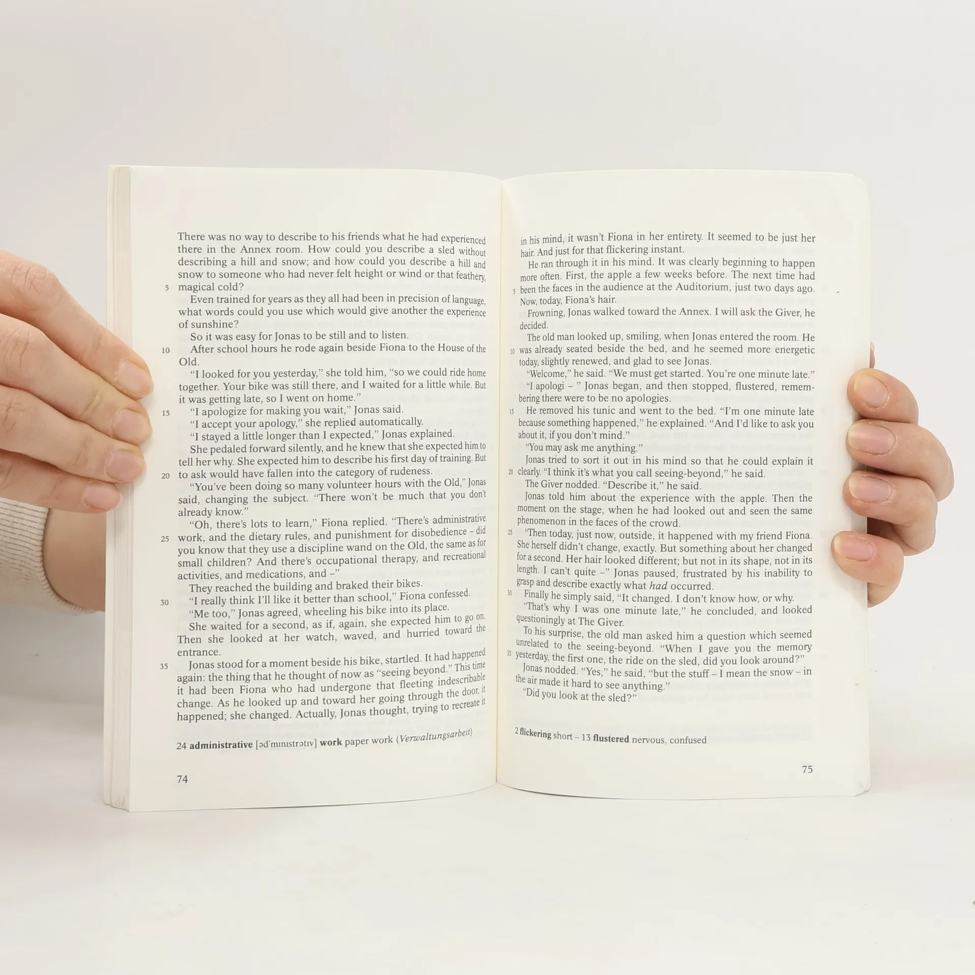 Jonas, the twelve-year-old protagonist of Lois Lowry's prize-winninge novel "The Giver" seems to live in a perfect world. In the Ceremony of Twelve he receives his lifetime assignement: he is chosen to be the new "Receiver of Memory" of his community. During his training, performed by "The Giver of Memory", Jonas finds out about the dark secrets that underlie the apparent harmony of his world