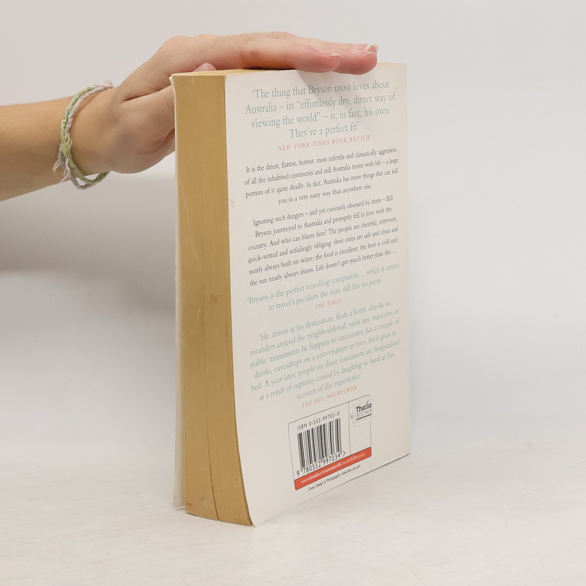 It is the driest, flattest, hottest, most desiccated, infertile and climatically aggressive of all the inhabited continents and still Australia teems with life - a large portion of it quite deadly. In tact, Australia has more things that can kill you in a very nasty way than anywhere else. Ignoring such dangers - and yet curiously obsessed by them - Bill Bryson journeyed to Australia and promptly fell in love with the country. And who can blame him ? The people are cheerful, extrovert, quick-witted and unfailingly obliging : their cities are safe and clean and nearly always built on water ; the food is excellent ; the beer is cold and the sun nearly always shines. Life doesn't get much better than this...