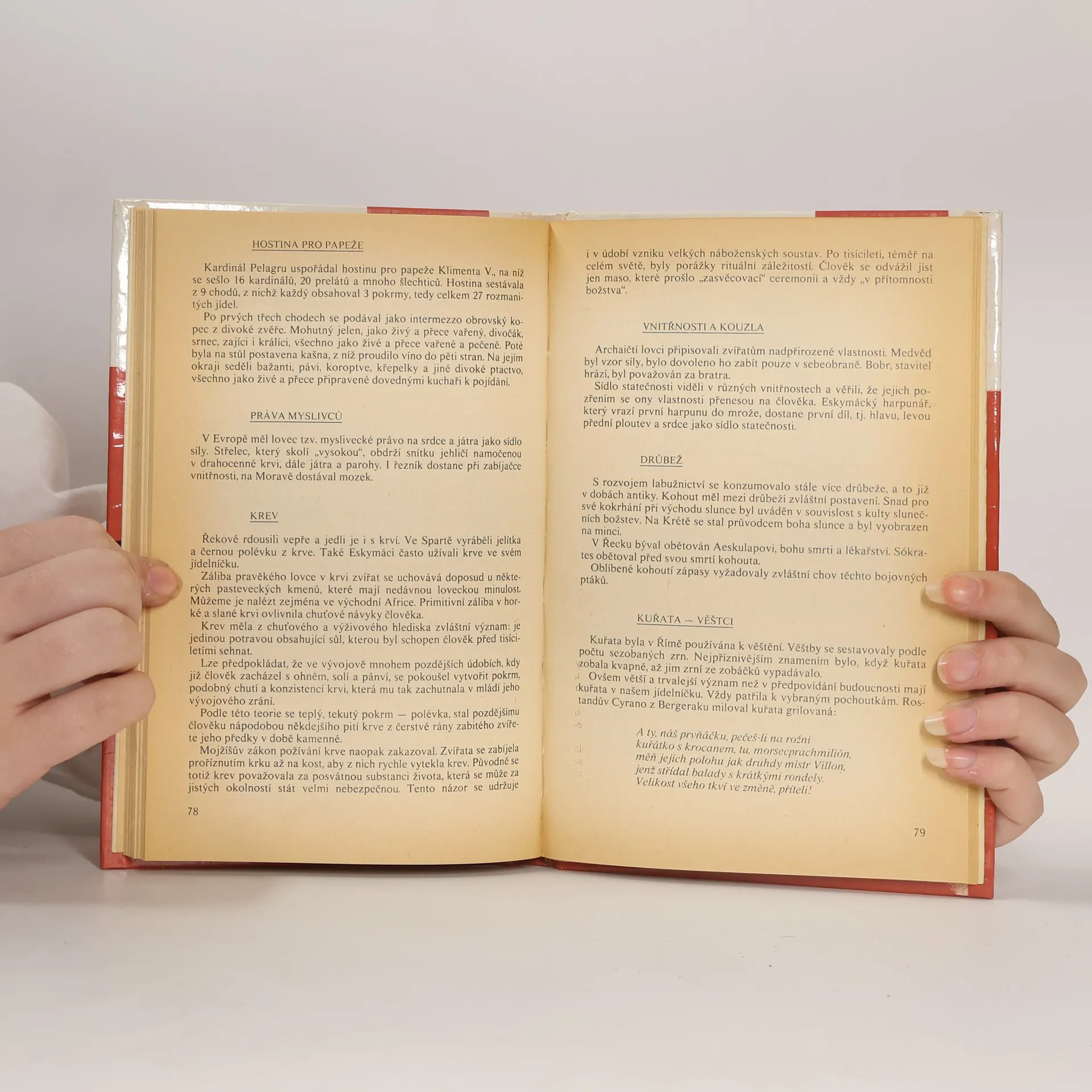 Vyprávění o pokrmech a nápojích v mýtech a legendách, historii i poezii. Popis středověkého stravování, hodokvasy, posty, základní potraviny, hospody a restaurace. Světové kuchyně a speciality.
