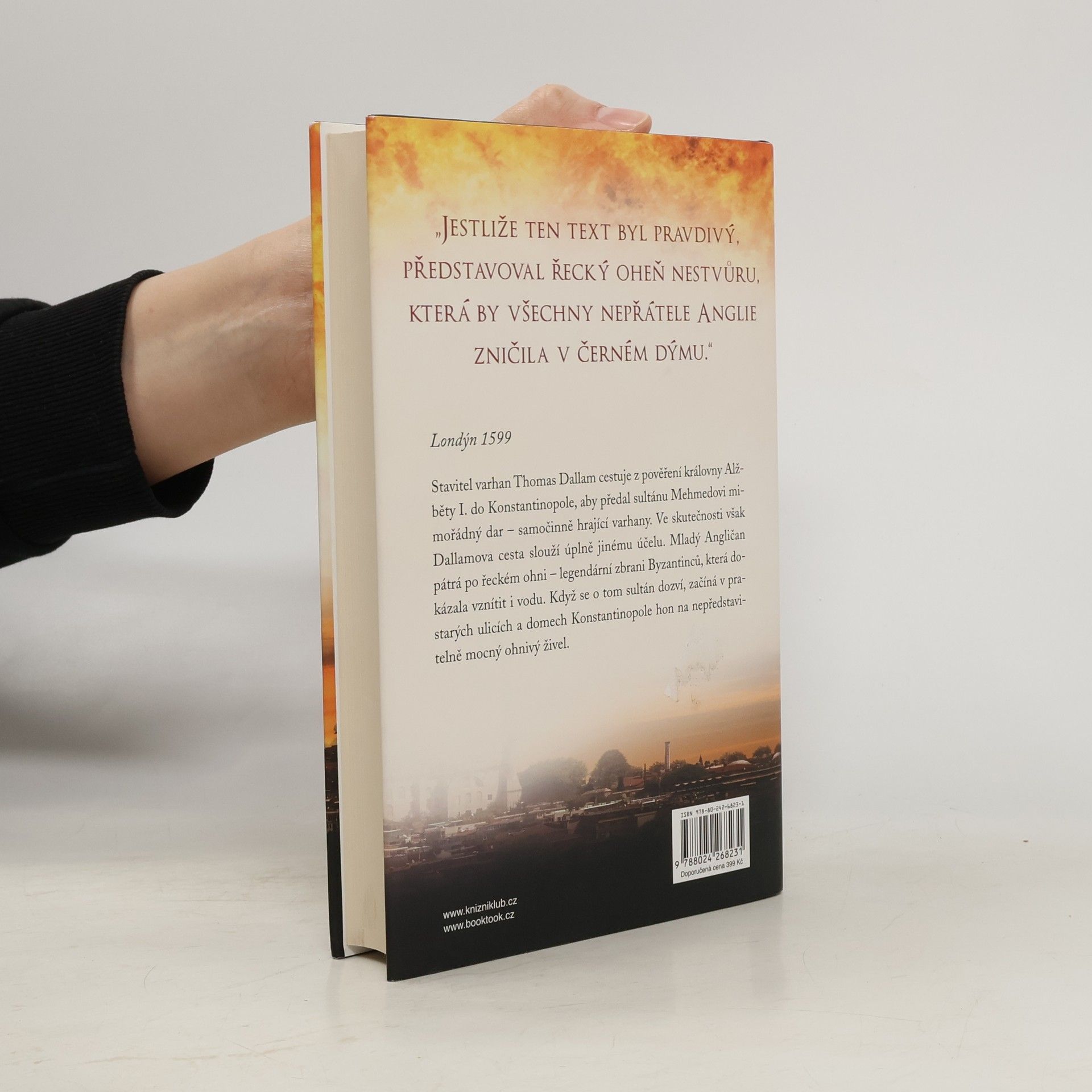 Londýn 1599 Stavitel varhan Thomas Dallam cestuje z pověření královny Alžběty I. do Konstantinopole, aby předal sultánu Mehmedovi mimořádný dar – samočinně hrající varhany. Ve skutečnosti však Dallamova cesta slouží úplně jinému účelu. Mladý Angličan pátrá po řeckém ohni – legendární zbrani Byzantinců, která dokázala vznítit i vodu. Když se o tom sultán dozví, začíná v prastarých ulicích a domech Konstantinopole hon na nepředstavitelně mocný ohnivý živel.