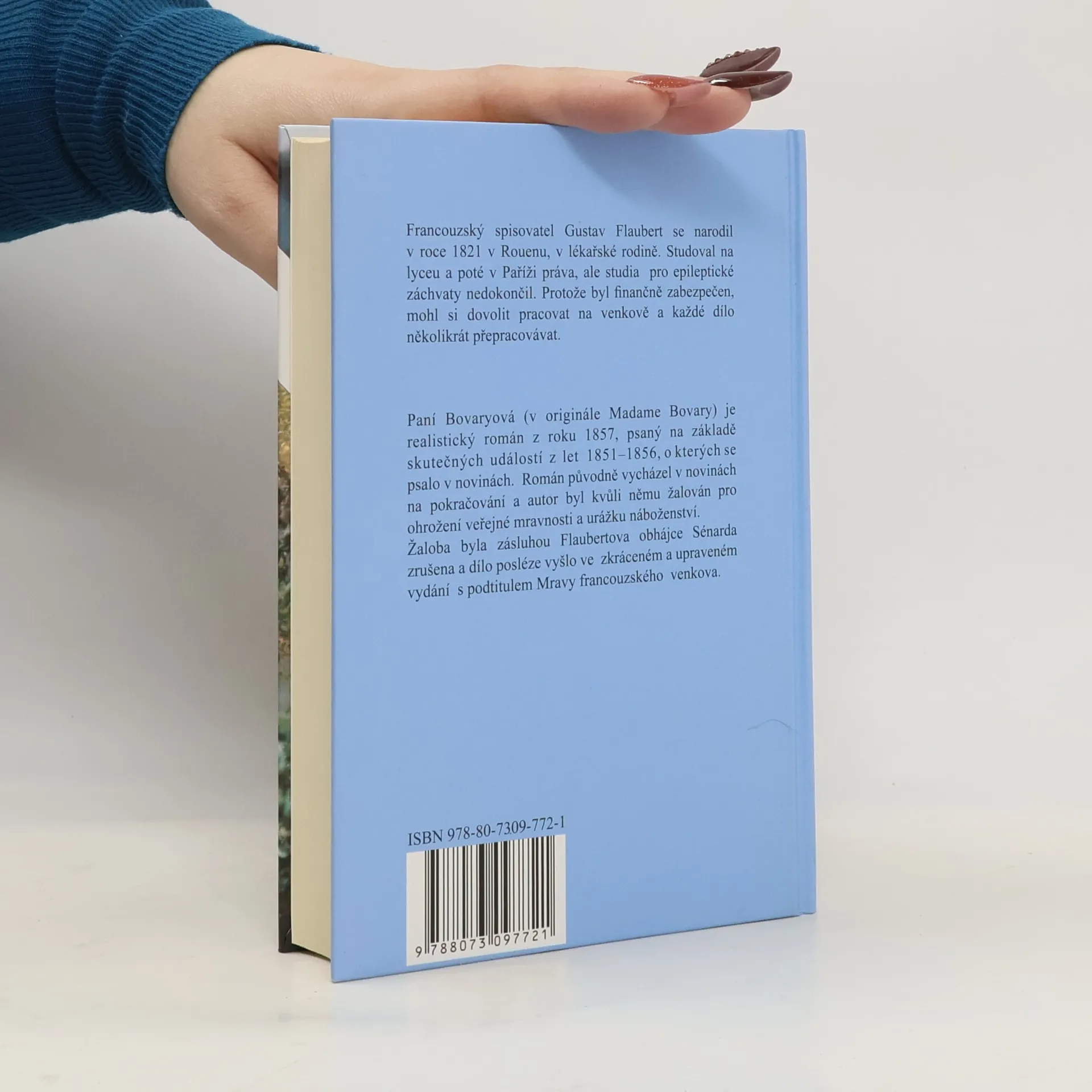 Flaubertovi se podařilo hluboce psychologicky prokreslit příběh romantické ženy, která nemůže ve všedním manželství nalézt uspokojení, natož pak životní cíl. Ema Bovaryová, podnícena romantickou četbou, chce poznat, zda-li existuje v životě opravdová vášeň a opojení, které si zcela podmaní člověka. Chce uniknout z hlouposti a farizejského pokrytectví své doby a svého prostředí, ale její iluze se postupně rozprchávají. Dostává se do milostných a peněžních dobrodružství, až skončí sebevraždou... V překladu Miloslava Jirdy 5. vydání. V nakladatelství Levné knihy, 2. vydání