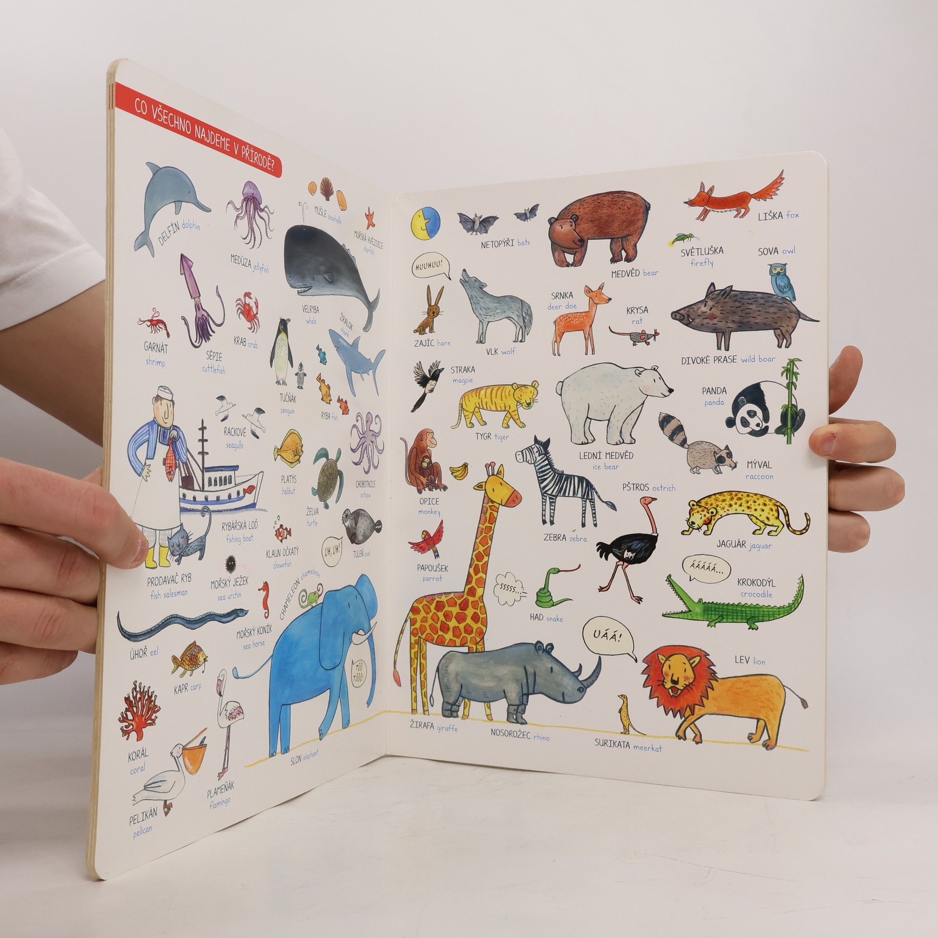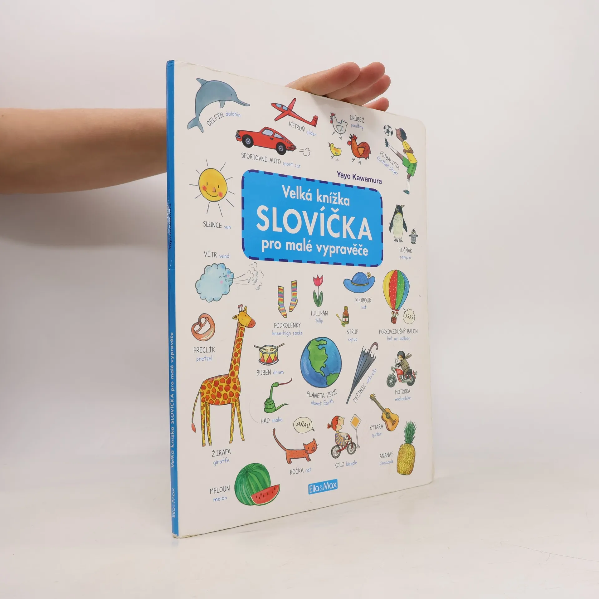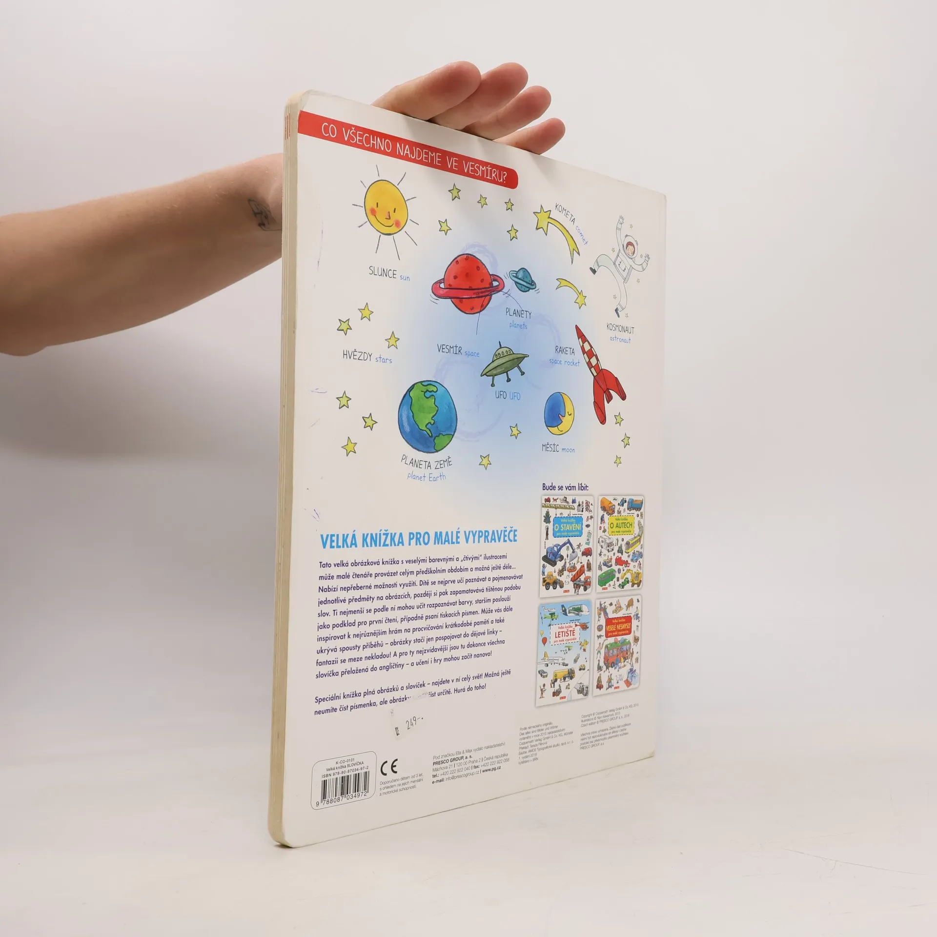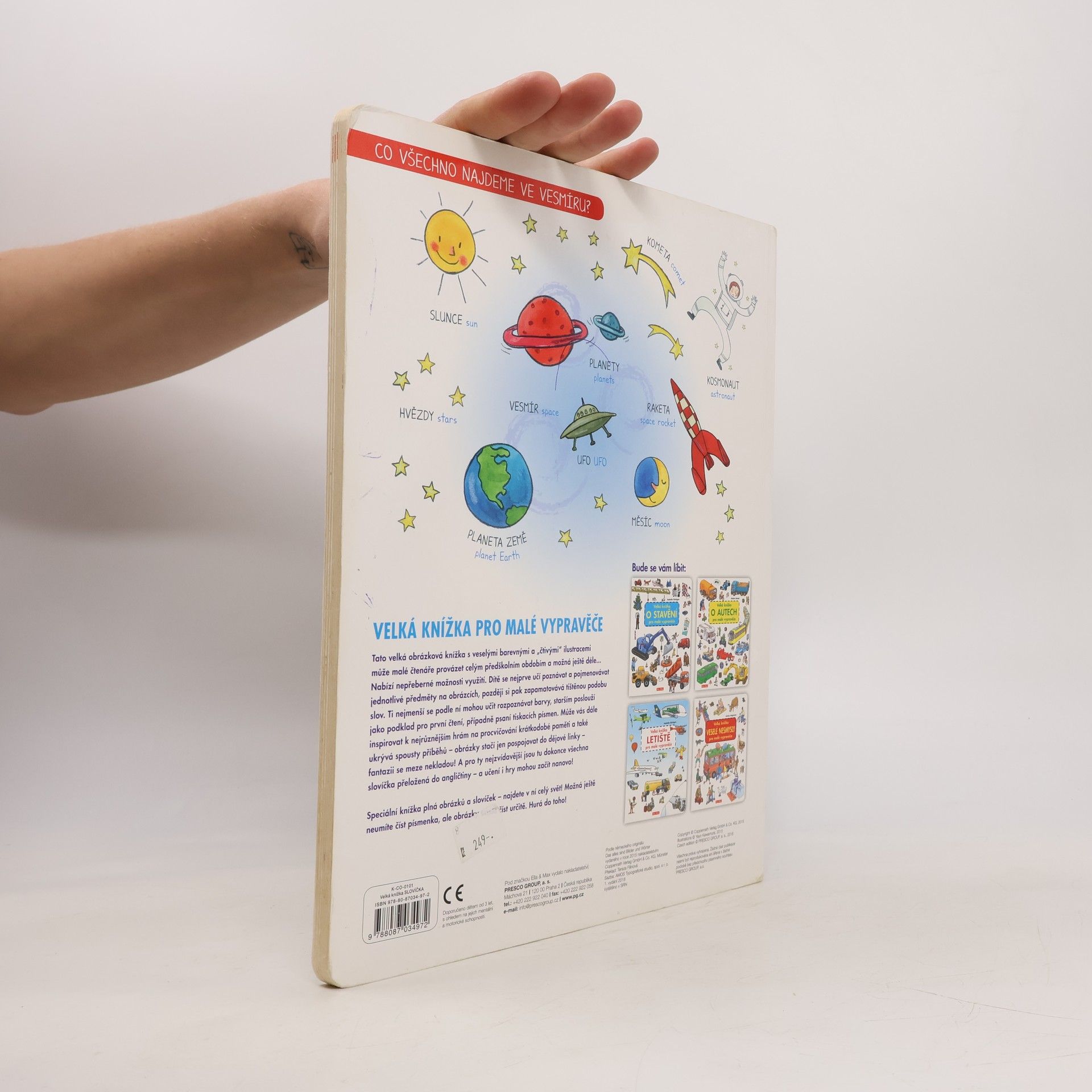 Tato velká obrázková knížka s veselými barevnými a "čtivými" ilustracemi může malé čtenáře provázet celým předškolním obdobím a možná ještě déle... Nabízí nepřeberné možnosti využití. Dítě se nejprve učí poznávat a pojmenovávat jednotlivé předměty na obrázcích, pozdějisi pak zapamatovává tištěnou podobu slov. Ti nejmenší se podle ní mohou učit rozpoznávat barvy, starším poslouží jako podklad pro první čtení, případně psaní tiskacích písmen. Může vás dále inspirovat k nejrůznějším hrám na procvičování krátkodobé paměti a také ukrývá spousty příběhů - obrázky stačí jen pospojovat do dějové linky - fantazii se meze nekladou! A pro ty nejzvídavější jsou tu dokonce všechna slovíčka přeložená do angličtiny - a učení i hry mohou začít nanovo! Speciální knížka plná obrázků a slovíček - najdete v ní celý svět! Možná ještě neumíte číst písmenka, ale obrázky umíte číst určitě. Hurá do toho!