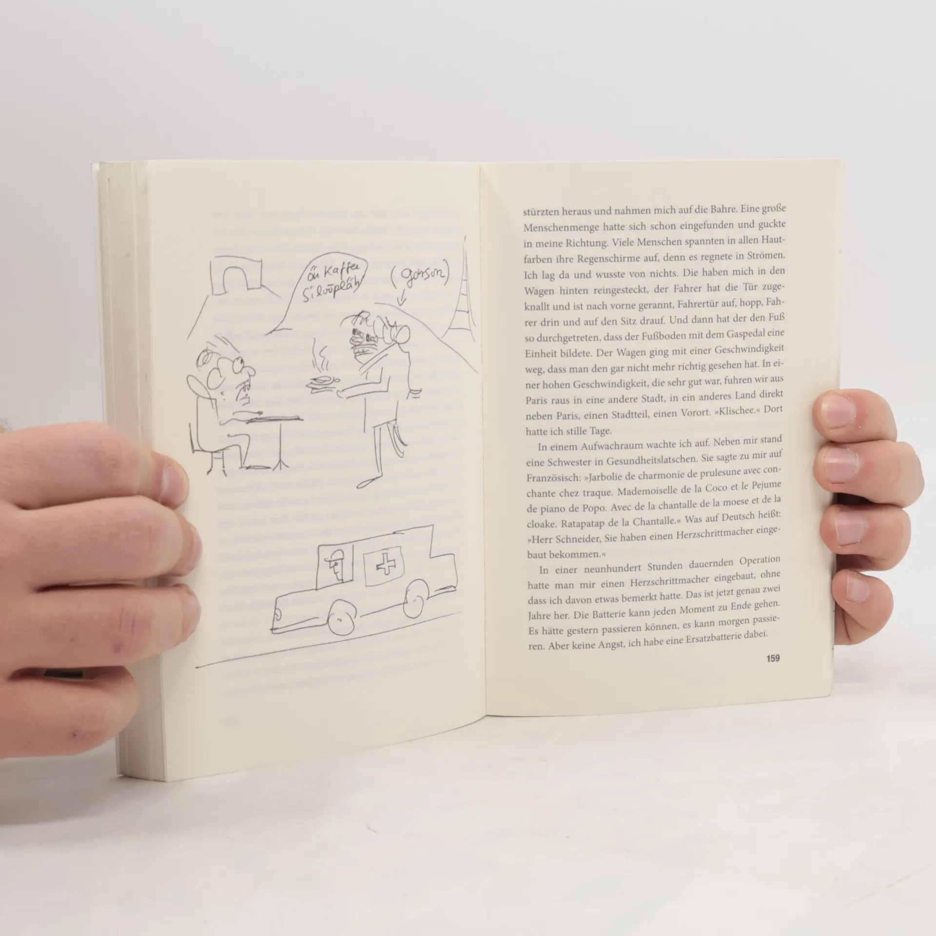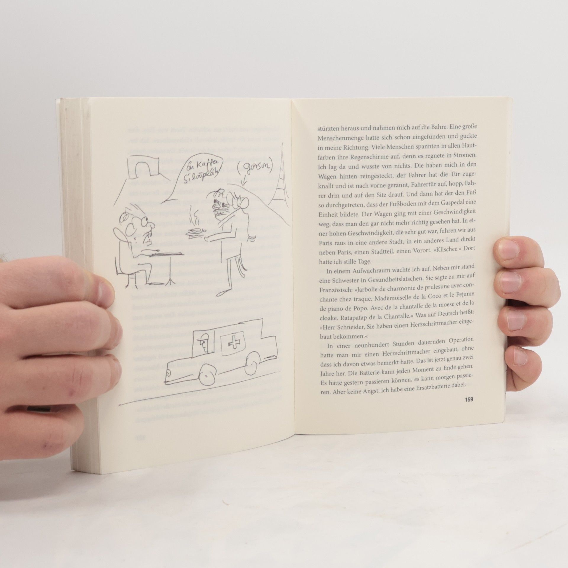 Unfassbar – Helge Schneider wird 60 »Als ich zum ersten Mal in Frankreich war, der Hauptstadt von Paris, saß ich in einem von diesen leckeren Straßencafés, die mit Glas überdacht sind wie eine Vitrine, wo man, wenn man drin sitzt, hochgucken kann, durch das Dach durch, in den Himmel hinein. Es war ein wunderschöner Maitag, der Himmel hatte die Farbe Blau gewählt, um uns zu imponieren. Die Blumen blühten in den Vasen mit aller Gewalt …« So beginnt Helge Schneiders berühmte Paris-Geschichte, die er in immer wieder neuen, fantastisch-verrückten Varianten seinem Konzertpublikum zwischen zwei Liedern erzählt hat. Der Erzähler genießt den Kaffee, der in Frankreich bekanntlich »hochkant in der Pfanne gebraten wird«, und lässt seine Geschichtenmaschine schnurren ohne Ende. Jeder, der Helge Schneider kennt, kennt auch diese surrealen Geschichten, von denen es Hunderte gibt, den »Orang Utan Klaus«, die »Kontaktlinse vom Wal«, den »Schweden-Urlaub«, Geschichten über Tierparkbesuche, die Erdkrustenerwärmung, das Eheleben, eine Nordpolexpedition oder das Schneeschippen. Endlich nun also das Buch, das die besten Geschichten aus 30 Jahren versammelt, schönstens illustriert vom Meister der Zeichenkunst, nämlich von Helge Schneider selbst.