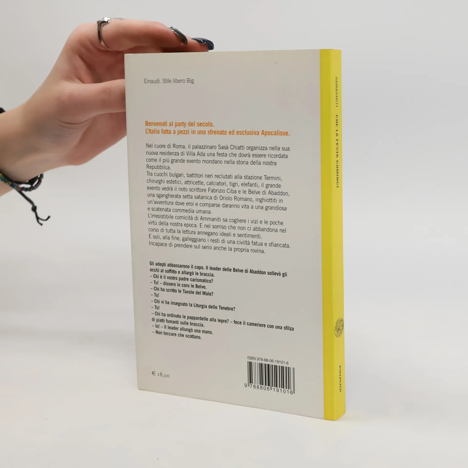 Nel cuore di Roma, il palazzinaro Sasà Chiatti organizza nella sua nuova residenza di Villa Ada una festa che dovrà essere ricordata come il più grande evento mondano nella storia della nostra Repubblica. Tra cuochi bulgari, battitori neri reclutati alla stazione Termini, chirurghi estetici, attricette, calciatori, tigri, elefanti, il grande evento vedrà il noto scrittore Fabrizio Ciba e le Belve di Abaddon, una sgangherata setta satanica di Oriolo Romano, inghiottiti in un'avventura dove eroi e comparse daranno vita a una grandiosa e scatenata commedia umana. La comicità di Ammaniti sa cogliere i vizi e le poche virtù della nostra epoca. E nel sorriso che non abbandona nel corso di tutta la lettura annegano ideali e sentimenti. E soli, alla fine, galleggiano i resti di una civiltà fatua e sfiancata. Incapace di prendere sul serio anche la propria rovina. Un romanzo spericolato dove Niccolò Ammaniti riunisce tutte le caratteristiche che ne fanno il beniamino di milioni di lettori. Il divertimento più scatenato insieme all'amore incondizionato per personaggi che non lasceremo più, fino all'ultima pagina. L'immaginazione anarchica insieme a una lucidità senza scampo che fruga e rivela ogni nostro più vergognoso segreto.
