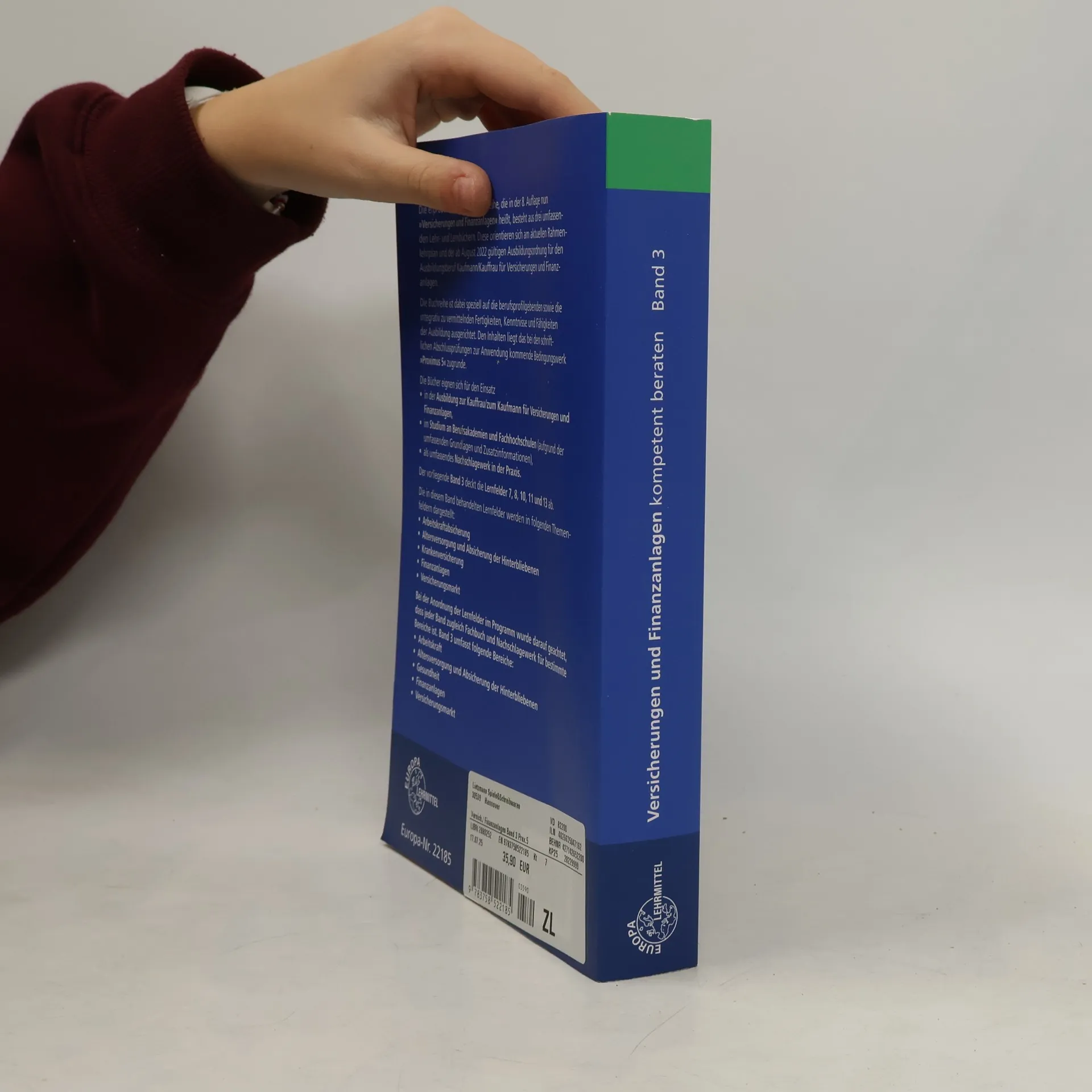 Die bewährte Buchreihe erscheint ab Sommer 2022 in komplett überarbeiteter 8. Auflage und heißt dann Versicherungen und Finanzanlagen. Sie besteht aus drei umfassenden Lehr- und Lernbüchern, die sich am aktuellen Rahmenlehrplan und der ab August 2022 gültigen Ausbildungsordnung für den Ausbildungsberuf Kaufmann/Kauffrau für Versicherungen und Finanzanlagen orientieren. Die Buchreihe ist dabei speziell auf die berufsprofilgebenden sowie die integrativ zu vermittelnden Fertigkeiten, Kenntnisse und Fähigkeiten der Ausbildung ausgerichtet. Den Inhalten liegt das bei den schriftlichen Abschlussprüfungen zur Anwendung kommende Bedingungswerk Proximus 5 zugrunde. Band 3 deckt die Lernfelder 7, 8, 10, 11 und 13 ab. Im Vergleich zur Vorauflage (7. Auflage) wurden der Aufbau und der Inhalt grundlegend geändert: - Anpassung an die neue Ausbildungsordnung und den neuen Rahmenlehrplan gültig ab August 2022 - Fokussierung auf Kundenberatung in Kundenbedarfsfeldern, Digitalität und Projektmanagement Kundenbedarfsfelder: - Wohnen (Hausratversicherung, Wohngebäudeversicherung, Glasversicherung, Elementarversicherung) - Rechtsstreitigkeiten und Ansprüche Dritter (Haftpflichtversicherung, Rechtsschutzversicherung) - Mobilität und Reisen (Kraftfahrzeugversicherung, Reiseabbruchversicherung, Reiserücktrittversicherung, Reisegepäckversicherung und Auslandsreisekrankenversicherung) - Arbeitskraft (Unfallversicherung, Berufsunfähigkeitsversicherung) - Gesundheit (Krankenversicherung, Pflegeversicherung) - Finanzanlagen (Schuldverschreibungen, Aktien, offene Investmentfonds) - Altersversorgung und Absicherung der Hinterbliebenen (Rentenversicherung, Lebensversicherung) - Änderungen wirtschaftlicher Daten und gesetzlicher Rahmenbedingungen Die Themen der Buchreihe werden durch weitere Titel für angehende Kaufleute für Versicherungen und Finanzanlagen im Verlagsprogramm ergänzt.