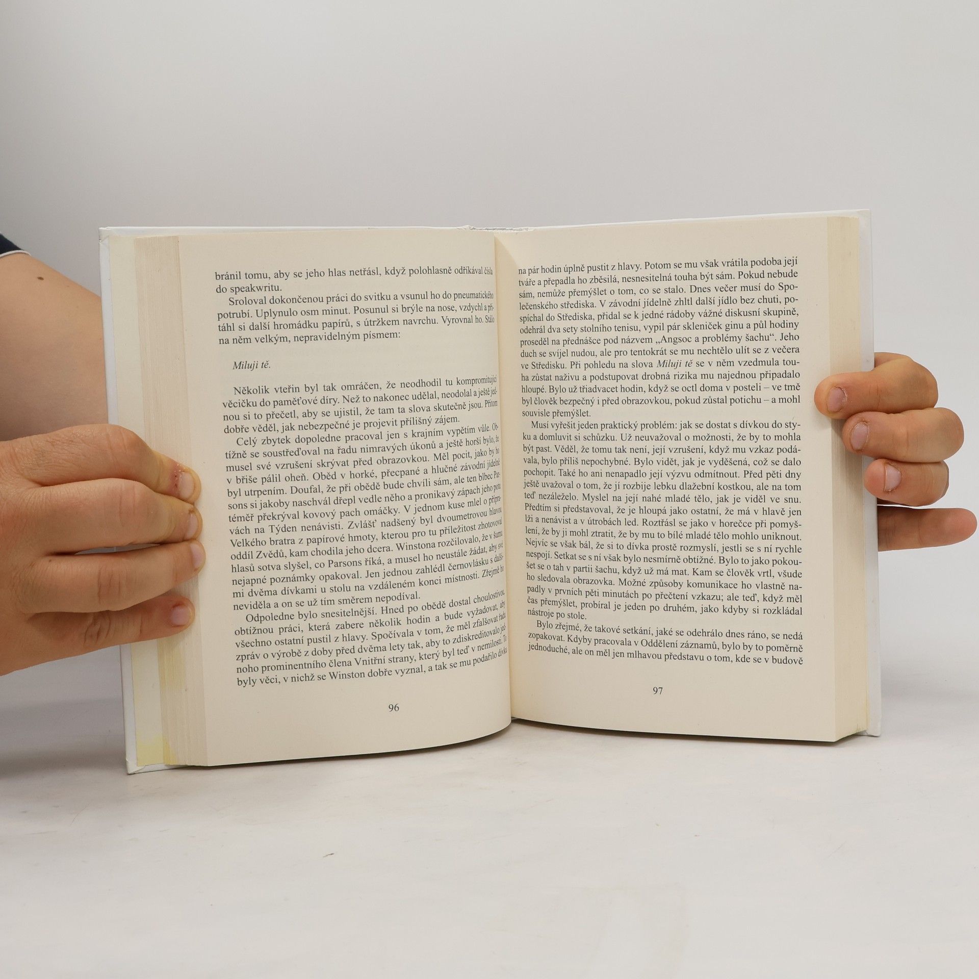 Winston Smith žije v Oceánii, jedné ze tří velmocí, které existují v Orwellově antiutopickém světě. V této zemi vládne svou neomezenou mocí Strana, v jejímž čele stojí (snad) imaginární postava Velkého bratra. Velký bratr tě sleduje! Heslo, které občané Oceánie spatřují mnohokrát denně na plakátech s údajnou podobiznou Velkého bratra v nadživotní velikosti. Ve Winstonově bytě, stejně jako v bytech ostatních členů Strany a na veřejných prostranstvích, jsou umístěny obrazovky, které nepřetržitě sledují veškeré dění ve svém dosahu. Záznamy obrazovek sledují příslušníci Ideopolicie, kteří se snaží odhalit jakýkoliv zločin proti Straně (ideozločin). Jedinými občany, kteří nejsou tak důsledně sledování, zůstávájí dělníci – proléti. Jejich životní podmínky jsou ale tak bídné, že opravdu nemají myšlenky na nějaký ideozločin. Navíc jsou dokonale ovládáni stranickou propagandou a slepě věří smyšleným úspěchům, které se dozví z obrazovky.