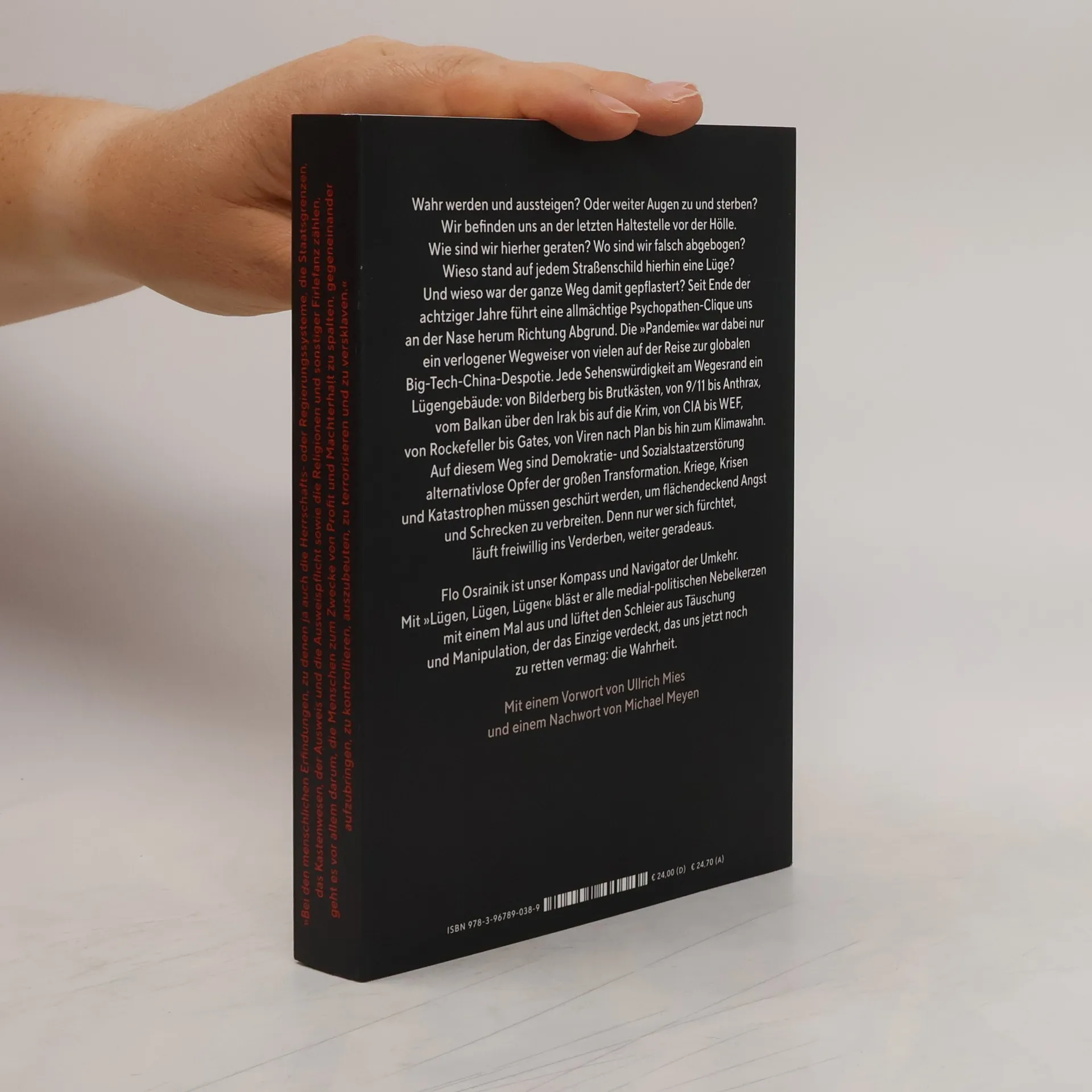 Wahr werden und aussteigen? Oder weiter Augen zu und sterben? Wir befinden uns an der letzten Haltestelle vor der Hölle. Wie sind wir hierher geraten? Wo sind wir falsch abgebogen? Wieso stand auf jedem Straßenschild hierhin eine Lüge? Und wieso war der ganze Weg damit gepflastert? Seit Ende der achtziger Jahre führt eine allmächtige Psychopathen-Clique uns an der Nase herum Richtung Abgrund. Die »Pandemie« war dabei nur ein verlogener Wegweiser von vielen auf der Reise zur globalen Big-Tech-China-Despotie. Jede Sehenswürdigkeit am Wegesrand ein Lügengebäude: von Bilderberg bis Brutkästen, von 9/11 bis Anthrax, vom Balkan über den Irak bis auf die Krim, von CIA bis WEF, von Rockefeller bis Gates, von Viren nach Plan bis hin zum Klimawahn. Auf diesem Weg sind Demokratie- und Sozialstaatzerstörung alternativlose Opfer der großen Transformation. Kriege, Krisen und Katastrophen müssen geschürt werden, um flächendeckend Angst und Schrecken zu verbreiten. Denn nur wer sich fürchtet, läuft freiwillig ins Verderben, weiter geradeaus. Flo Osrainik ist unser Kompass und Navigator der Umkehr. Mit »Lügen, Lügen, Lügen« bläst er alle medial-politischen Nebelkerzen mit einem Mal aus und lüftet den Schleier aus Täuschung und Manipulation, der das Einzige verdeckt, das uns jetzt noch zu retten vermag: die Wahrheit.