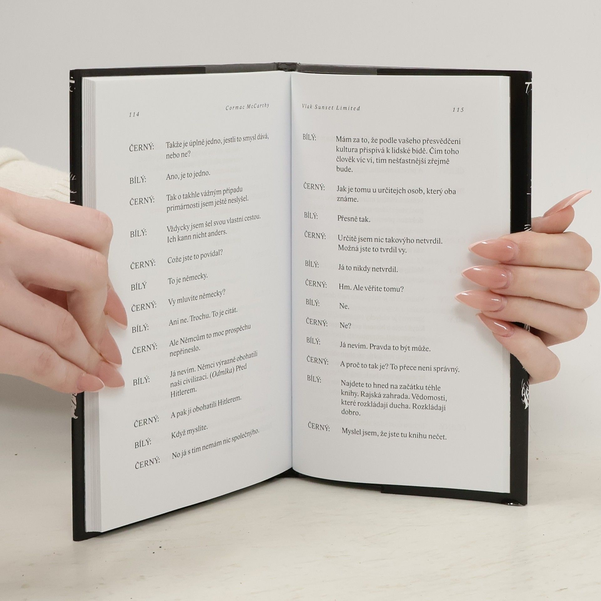 „Román v divadelní formě“ poněkud vybočuje z celku McCarthyho díla: nejen tím, že vznikl původně jako divadelní hra (jež se v roce 2006 hrála s úspěchem na Broadwayi a v Chicagu), ale také přísnou jednotou místa a času, strohým jazykem a na kost oholenými dialogy. Setkáváme se v něm jen se dvěma postavami, označenými jako „Černý“ a „Bílý“, jež spolu vedou dlouhý rozhovor v zašlém newyorském bytě – a neřeší přitom nic menšího než otázku po smyslu života. „Bílý“, nihilisticky založený profesor humanitních věd, je pevně rozhodnutý spáchat sebevraždu, „Černý“, bývalý kriminálník, jenž díky kdysi nalezené víře v Boha změnil svůj život od základu, se mu jeho úmysl pokouší rozmluvit. Zdánlivě jednoduchý půdorys díla se ovšem v brilantním McCarthyho podání komplikuje a zpočátku přehledná, jednoznačně rozvržená pře obou mužů se postupně mění v rafinovanou disputaci nabitou symbolickými významy, v níž jako by se střetával Tomáš Akvinský se Samuelem Beckettem.