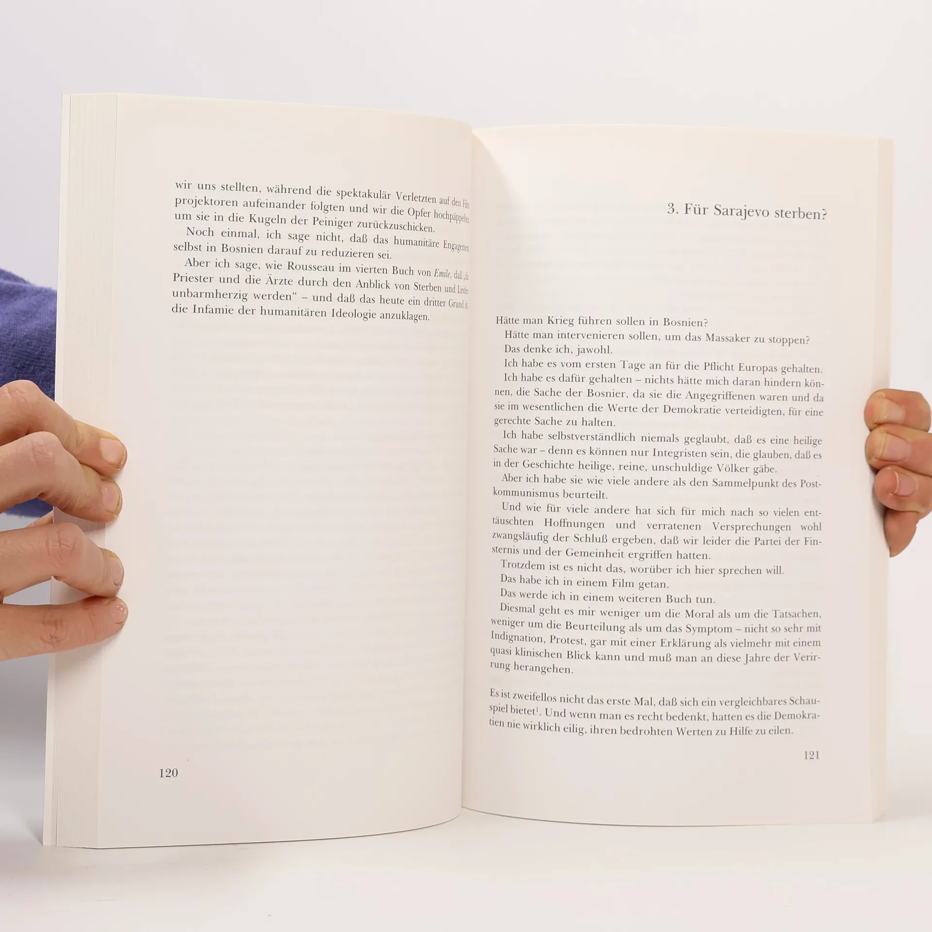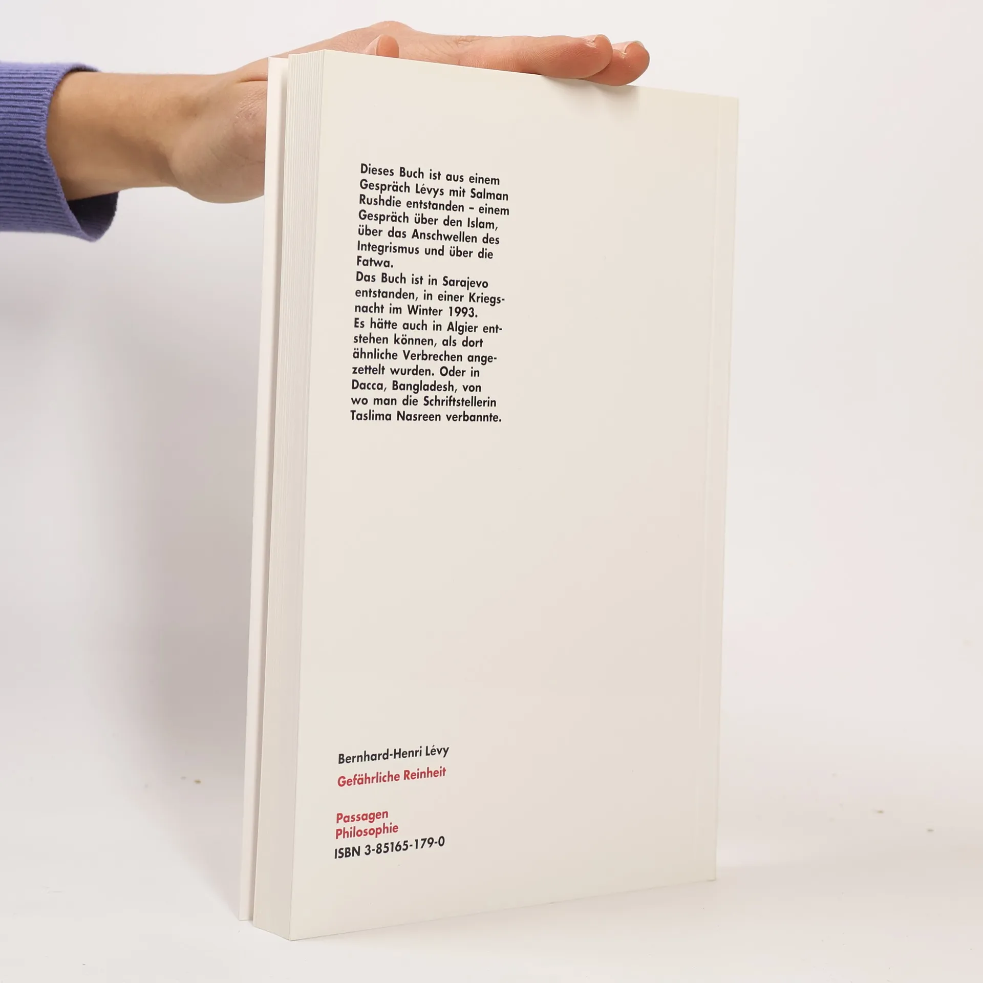 Dieses Buch ist aus einem Gespräch Lévys mit Salman Rushdie entstanden; einem Gespräch über den Islam, über das Anschwellen des Integralismus und über die Fatwah. „Die Islamisten fordern Europa heraus, sagte er mir. Sie möchten sehen, was die universalen Werte – in ihren Augen – gelten. Sie möchten wissen, bis wohin ihre Liebe geht, und wie sie sich beugen wird“. Das Buch ist in Sarajevo entstanden, in einer Kriegsnacht im Winter 1993. Es hätte auch in Algier entstehen können, als dort ähnliche Verbrechen angezettelt wurden. Oder in Dacca, Bangla Desh, von wo man die Schriftstellerin Taslima Nasreen verbannte. Dieses Buch ist in Paris entstanden, in einer Zeit der Konfusion, in der es keine Stabilität mehr gibt, weder in der Welt noch in den Köpfen. Warum verbindet sich in der Politik das Schlimmste so oft mit einer gewissen Idee der Tugend, einem Ideal der „Reinheit“, in deren Namen zu allen Zeiten und an allen Orten Barbareien begangen wurden und werden? Und können wir hoffen, dieser gefährlichen Reinheit einmal ein Ende zu machen?