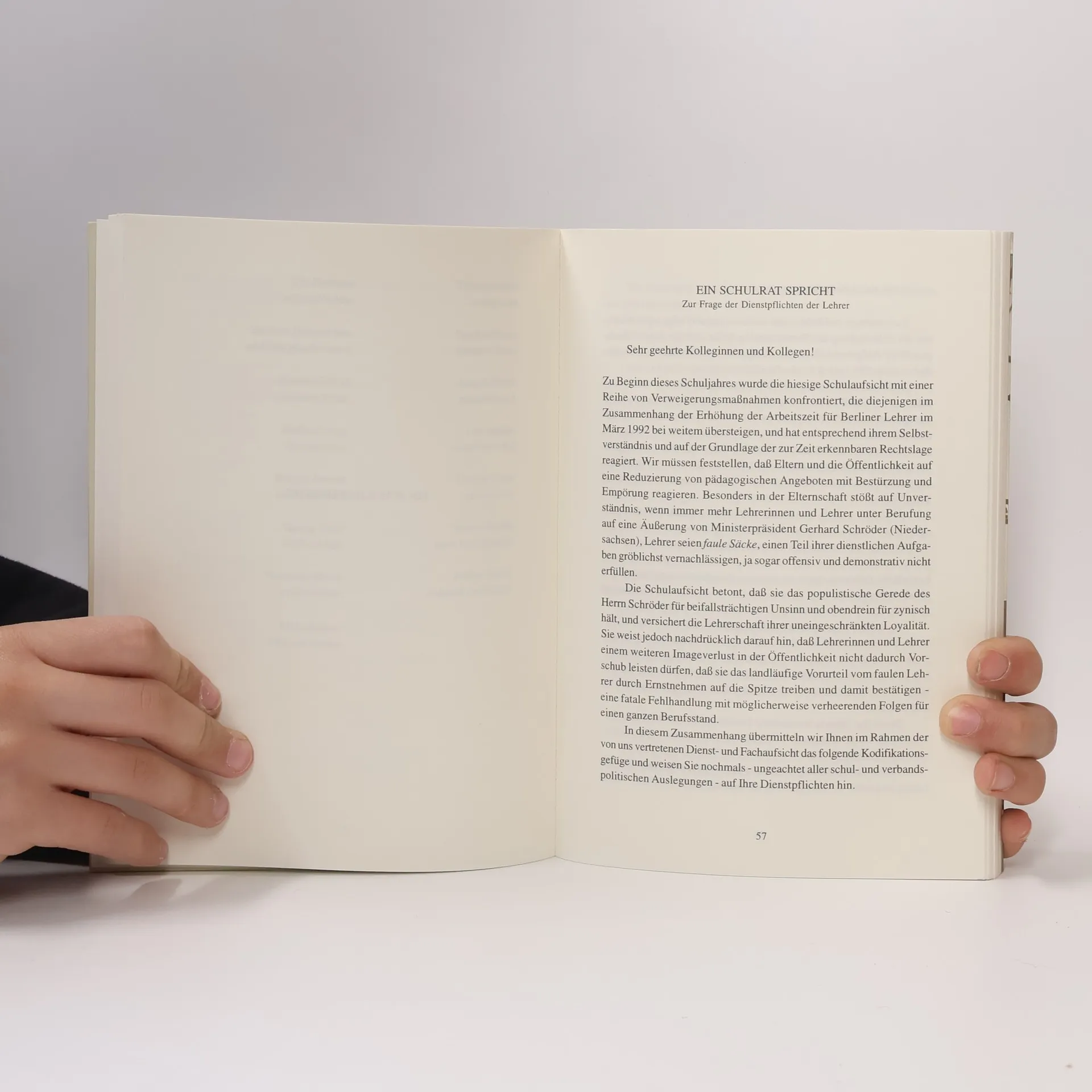Ob nun den unter Pädagogen heftig beliebten Konferenzen („Sanfter Schrecken“) oder der seichten ZDF-Serie „Unser Lehrer Dr. Specht“, allem und allen hält Schwandt in diesem Band den kritischen Spiegel vor, der gelegentlich auch zum Zerrspiegel wird. Mit seinen „Nachrichten aus der pädagogischen Provinz“ (so der Untertitel) „möchte ich gern Vorurteile bedienen, aber auch meinen schwer gescholtenen Berufsstand rehabilitieren, dabei aber immer unterhalten und ein wenig erheitern,“ so der Autor, der auch sich selbst nicht verschont: „Lehrer sind so ziemlich das letzte“.