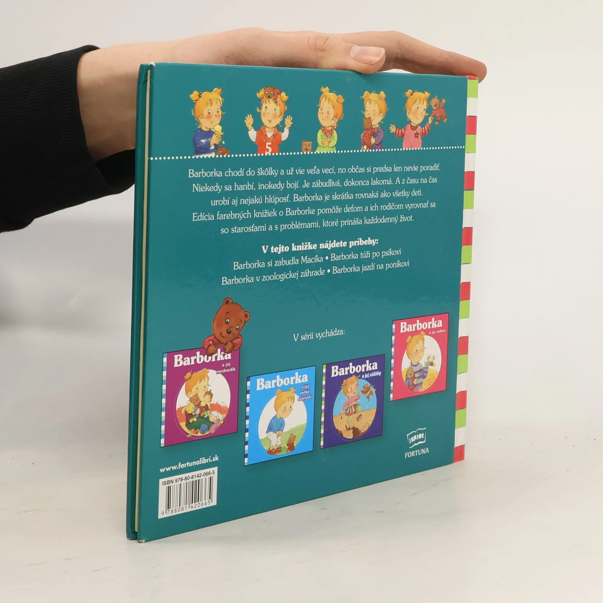Barborka chodí do škôlky a už vie veľa vecí, no občas si predsa len nevie poradiť. Niekedy sa hanbí, inokedy sa bojí. Je zábudlivá, dokonca lakomá. A z času na čas urobí aj nejakú hlúposť. Barborka je skrátka rovnaká ako všetky deti. Edícia farebných knižiek o Barborke pomôže deťom a ich rodičom vyrovnať sa so starosťami a s problémami, ktoré prináša každodenný život. V tejto knižke nájdete príbehy: Barborka si zabudla Macíka • Barborka túži po psíkovi Barborka v zoologickej záhrade • Barborka jazdí na poníkovi