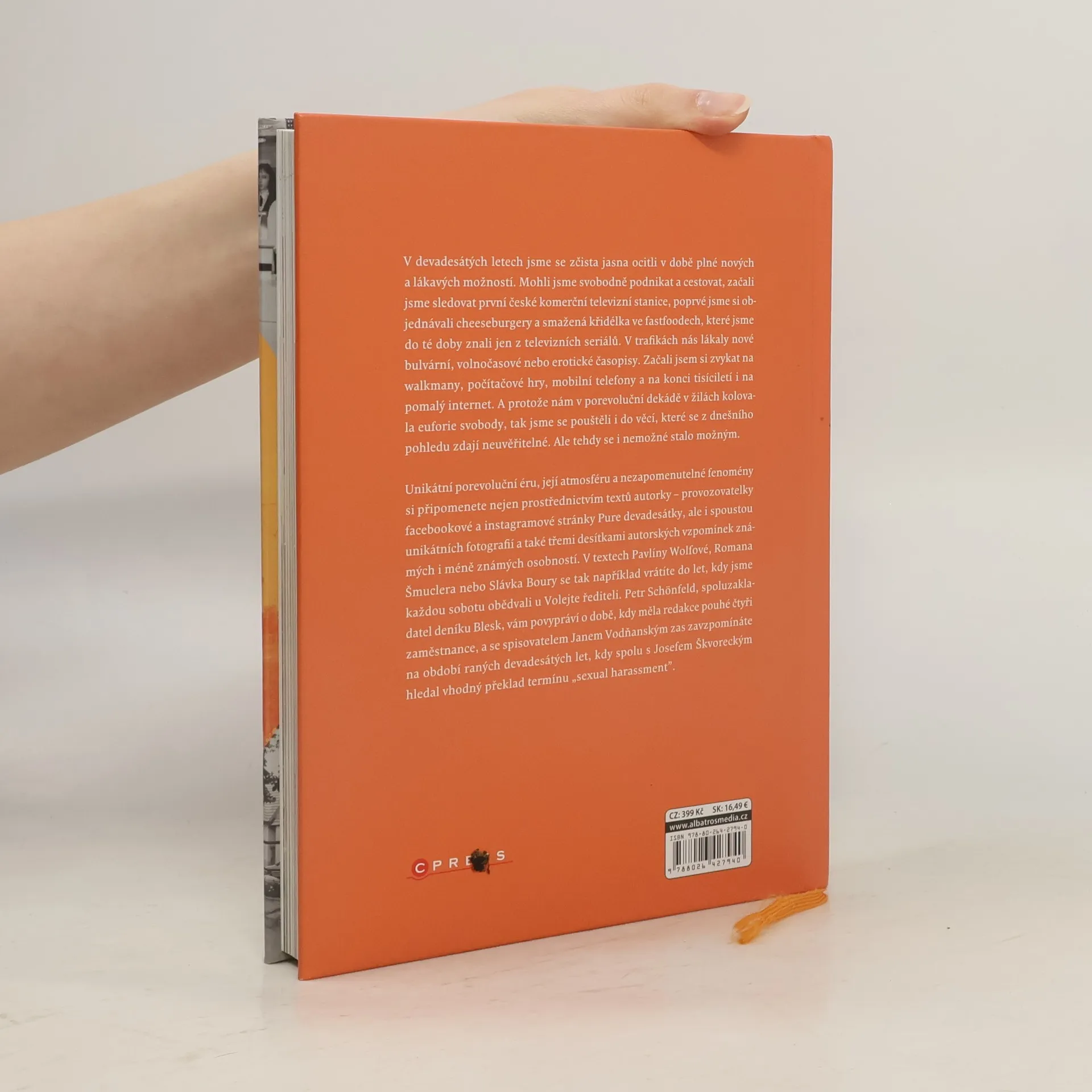 V devadesátých letech jsme se zčista jasna ocitli v době plné nových a lákavých možností. Mohli jsme svobodně podnikat a cestovat, začali jsme sledovat první české komerční televizní stanice, poprvé jsme si objednávali cheeseburgery a smažená křidélka ve fastfoodech, které jsme do té doby znali jen z televizních seriálů. V trafikách nás lákaly nové bulvární, volnočasové nebo erotické časopisy. Začali jsem si zvykat na walkmany, počítačové hry, mobilní telefony a na konci tisíciletí i na pomalý internet. A protože nám v porevoluční dekádě v žilách kolovala euforie svobody, tak jsme se pouštěli i do věcí, které se z dnešního pohledu zdají neuvěřitelné. Ale tehdy se i nemožné stalo možným. Unikátní porevoluční éru, její atmosféru a nezapomenutelné fenomény si připomenete nejen prostřednictvím textů autorky – provozovatelky facebookové a instagramové stránky Pure devadesátky, ale i spoustou unikátních fotografií a také třemi desítkami autorských vzpomínek známých i méně známých osobností. V textech Pavlíny Wolfové, Romana Šmuclera nebo Slávka Boury se tak například vrátíte do let, kdy jsme každou sobotu obědvali u Volejte řediteli. Petr Schönfeld, spoluzakladatel deníku Blesk, vám povypráví o době, kdy měla redakce pouhé čtyři zaměstnance, a se spisovatelem Janem Vodňanským zas zavzpomínáte na období raných devadesátých let, kdy s Josefem Škvoreckým hledal vhodný překlad termínu „sexual harassment”.