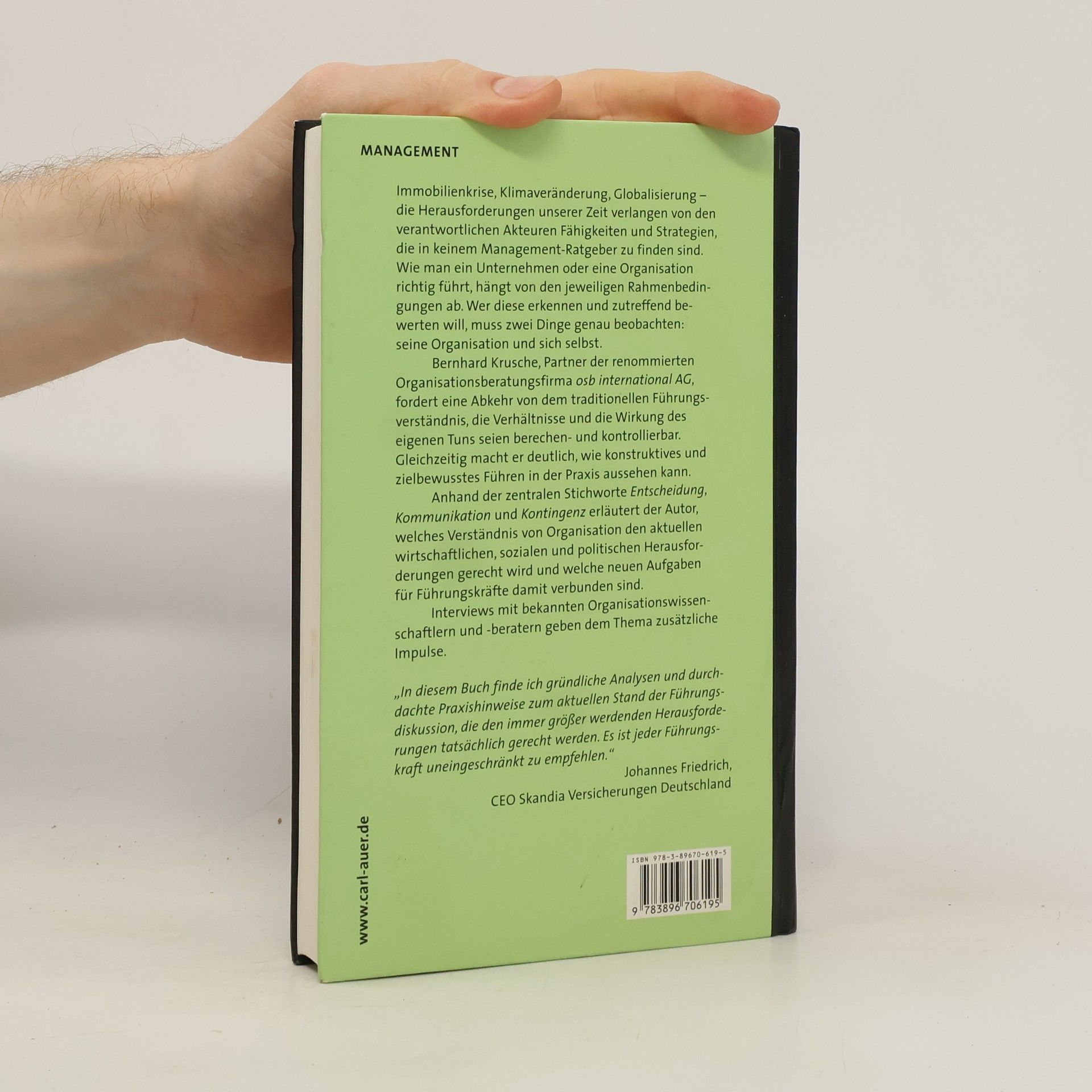 Immobilienkrise, Klimaveränderung, Globalisierung – die Herausforderungen unserer Zeit verlangen von den verantwortlichen Akteuren Fähigkeiten und Strategien, die in keinem Management-Ratgeber zu finden sind. Denn wie man ein Unternehmen oder eine Organisation richtig führt, hängt ganz von den jeweiligen Rahmenbedingungen ab. Wer diese erkennen und zutreffend bewerten will, muss zwei Dinge genau beobachten: seine Organisation und sich selbst. Bernhard Krusche, Partner der renommierten Organisationsberatungsfirma osb international AG, fordert eine Abkehr von dem traditionellen Führungsverständnis, die Verhältnisse und die Wirkung des eigenen Tuns seien berechen- und kontrollierbar. Gleichzeitig macht er deutlich, wie konstruktives und zielbewusstes Führen in der Praxis aussehen kann. Anhand der zentralen Stichworte Entscheidung, Kommunikation und Kontingenz erläutert der Autor, welches Verständnis von Organisation den aktuellen wirtschaftlichen, sozialen und politischen Herausforderungen gerecht wird und welche neuen Aufgaben für Führungskräfte damit verbunden sind. Interviews mit bekannten Organisationswissenschaftlern und -beratern geben dem Thema zusätzliche Impulse.