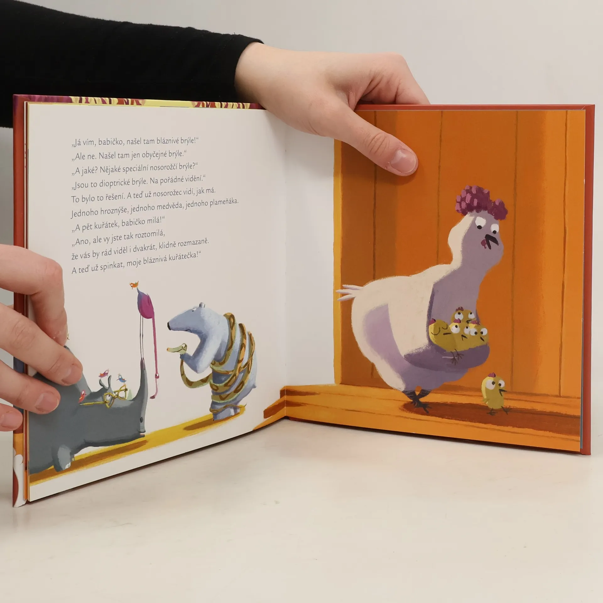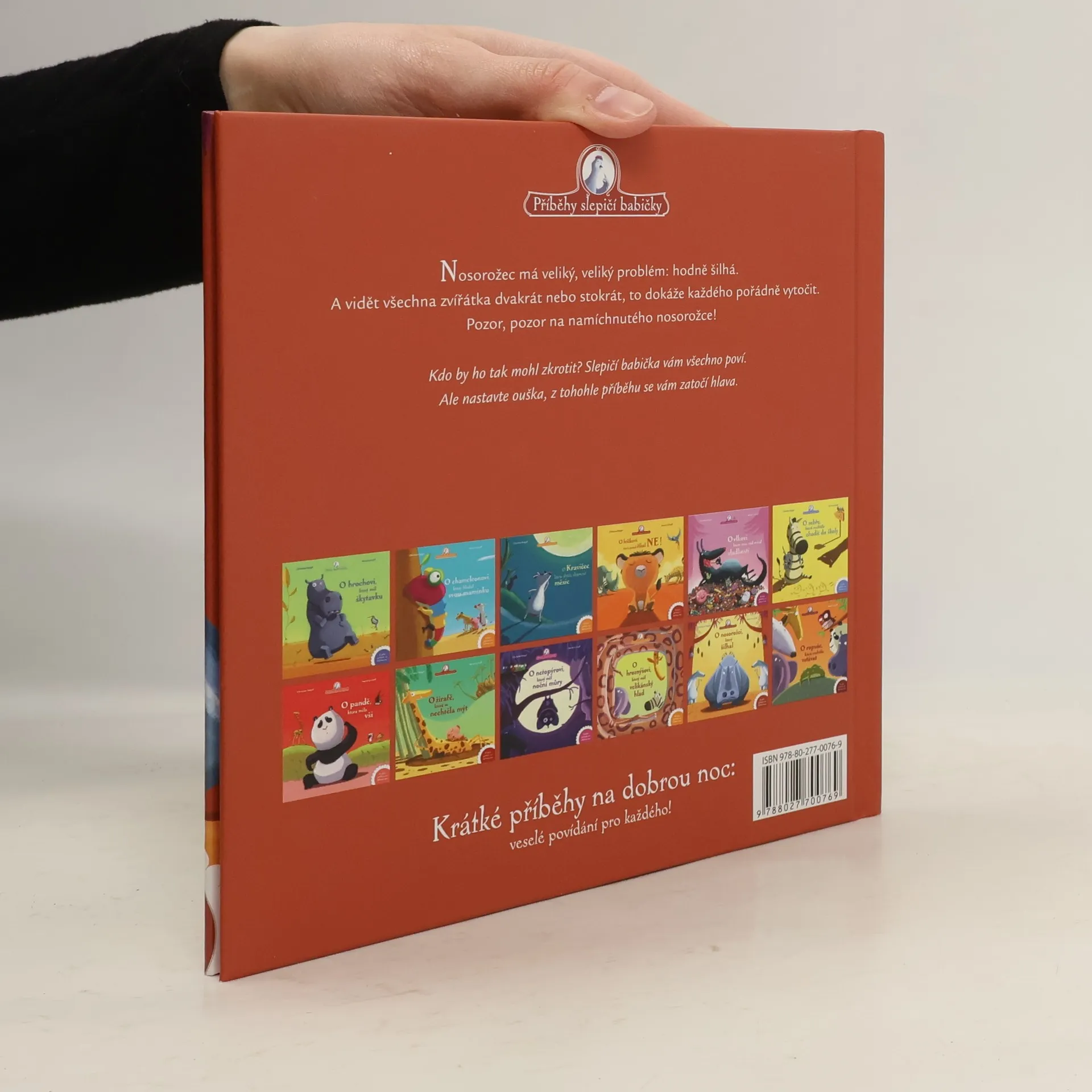 Nosorožec měl veliký problém. Oči mu šly tak šejdrem, že všechna zvířátka viděl hned několikrát. To ho pěkně namíchlo. Víte, jak to vyřeší? Dokáže si s tím poradit sám? Nebo mu někdo pomůže? Slepičí babička vám všechno poví.