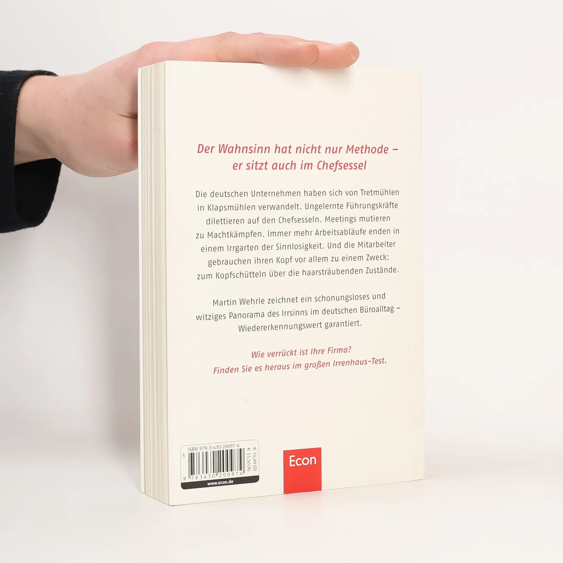 In deutschen Betrieben herrschen haarsträubende Zustände – ob in mittelständischen Unternehmen oder großen Konzernen, die zunehmend zu geschlossenen Anstalten mutieren. Tyrannische Chefs pflegen ihre Marotten. Statt über Sachfragen zu diskutieren, werden in endlosen Meetings Machtkämpfe ausgefochten. Absurde Arbeitsabläufe sind fast schon die Regel. Der renommierte Karrierecoach Martin Wehrle liefert einen schonungslosen Bericht aus dem Katastrophengebiet Büro. Anhand eines Tests kann der Leser herausfinden, wie sehr der Wahnsinn in seiner Firma das Zepter schwingt. Wehrle gibt zudem anschauliche Tipps, wie Sie den Bürowahnsinn überleben und irren Arbeitgebern durch ein Frühwarnsystem aus dem Weg gehen. Ein Buch für alle, die Tag für Tag wahnwitzige Arbeitsbedingungen zu ertragen haben.