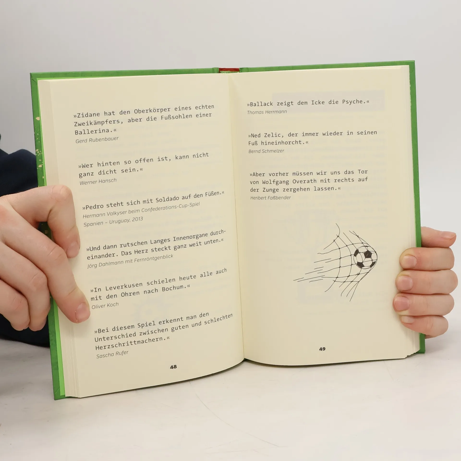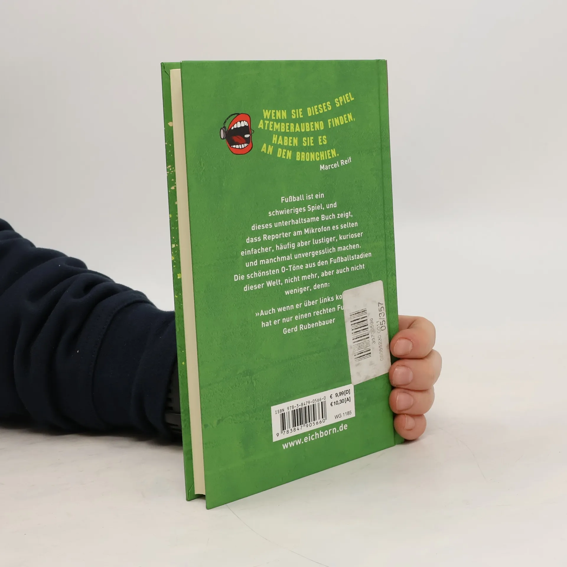 „Wenn Sie dieses Spiel atemberaubend finden, haben Sie es an den Bronchien“ Marcel Reif Von „Der Oberarm gehört zur Hand“ (Béla Réthy) über „Da geht er, ein großer Spieler. Ein Mann wie Steffi Graf“ (Jörg Dahlmann) bis „Wer hinten so offen ist, kann nicht ganz dicht sein“ (Werner Hansch): Fußball ist ein schwieriges Spiel, und dieses unterhaltsame Buch zeigt, dass Reporter am Mikrofon es selten einfacher, häufig aber lustiger, kurioser und manchmal unvergesslich machen. Die schönsten O-Töne aus den Fußballstadien dieser Welt, nicht mehr, aber auch nicht weniger, denn: „Auch wenn er über links kommt, hat er nur einen rechten Fuß“ (Gerd Rubenbauer).