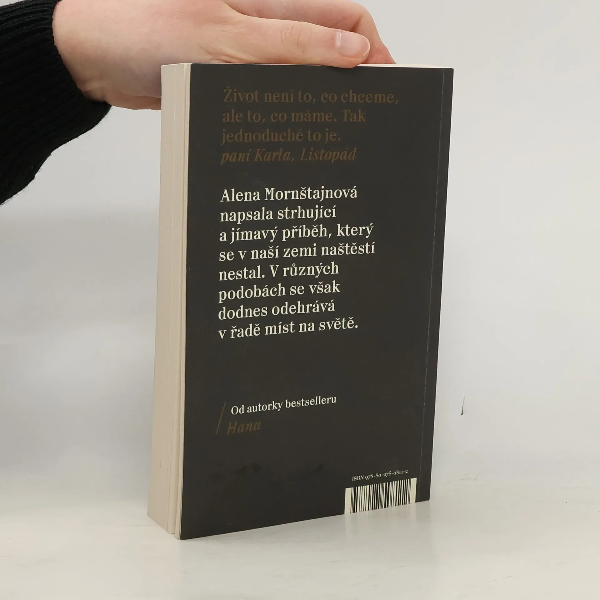 Ptali jste se někdy sami sebe, jaký by byl váš život, kdyby v listopadu 1989 dopadlo všechno jinak? Jaké by byly naše osudy, kdyby komunismus neskončil a my zůstali za železnou oponou oddělující nás od světa i jeden od druhého? Jedna z nejúspěšnějších českých spisovatelek Alena Mornštajnová opět překvapuje. Její nový román je dramatickým příběhem obyčejné rodiny, kterou velké dějiny jedné listopadové noci rozdělí a postaví proti sobě. Sledujeme příběh Marie Hajné, která je kvůli účasti na demonstracích zatčena a odsouzena ke dvaceti letům vězení. Ví, že už nejspíš nikdy neuvidí vyrůstat své děti, a při životě ji udržují jen dopisy. A taky naděje, že se nakonec přece jen shledají. Vedle toho se odvíjí příběh dívenky Magdaleny, která je odebrána rodičům a umístěna do „ozdravovny“, v níž se vychovávají nové komunistické kádry. Jejich osudy se jednoho dne protnou, ale zcela jinak, než si obě představovaly a přály. Od autorky bestselleru Hana.