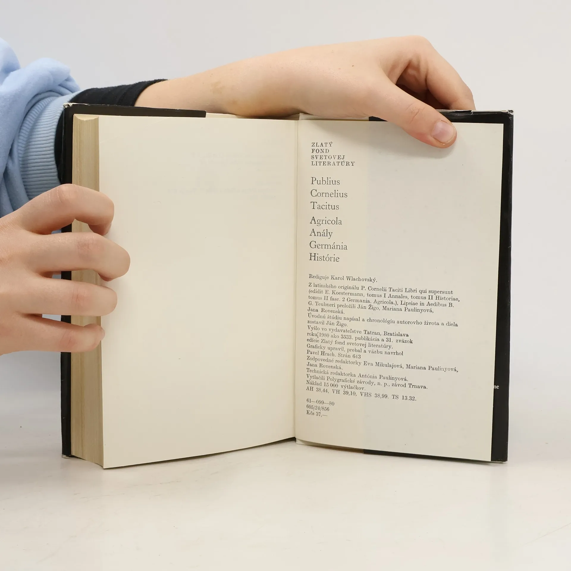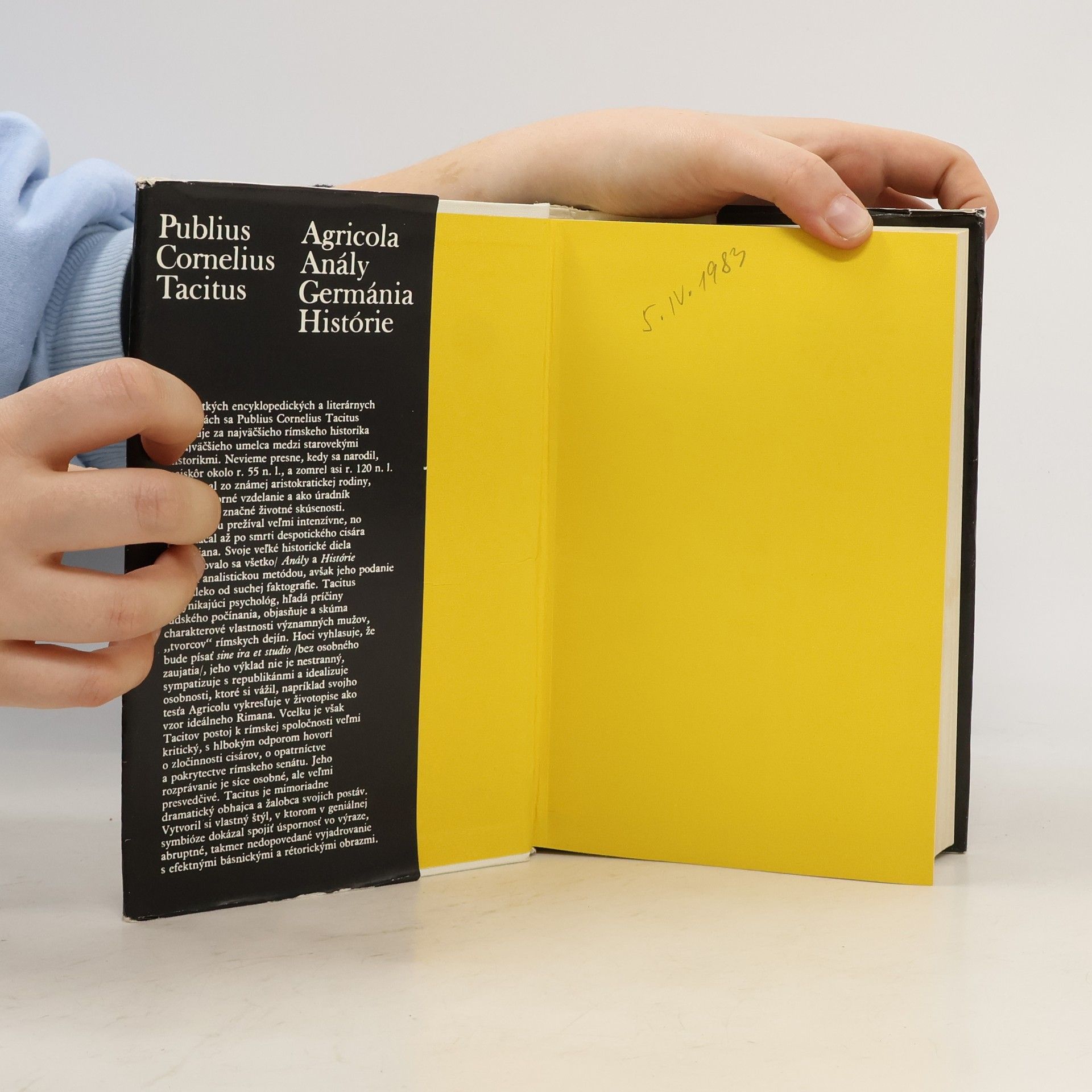 Kniha obsahuje historické diela, ktorých autorom je Publius Cornelius Tacitus - označovnaý za najväčšieho rímskeho historika a najväčšieho umelca medzi starovekými historikmi. V knihe nájdete aj diela Anály a Histórie, ktoré Tacitus napísal analisticky, avšak "jeho podanie má ďaleko od suchejfaktografie. Tacitus je vynikajúci psychológ, hľadá príčiny ľudského počínania, objasňuje a skúma charakterové vlastnosti významných mužov, tvorcov rímskych dejín ... Tacitus je mimoriadne dramatický obhajca a žalobca svojich postáv. Vytvoril si vlastný štýl, v ktorom v geniálnej symbióze dokázal spojiť úspornosť vo výraze, abruptné, takmer nedopovedané vyjadrovanie s efektými básnickými a rétorickým obrazmi."
