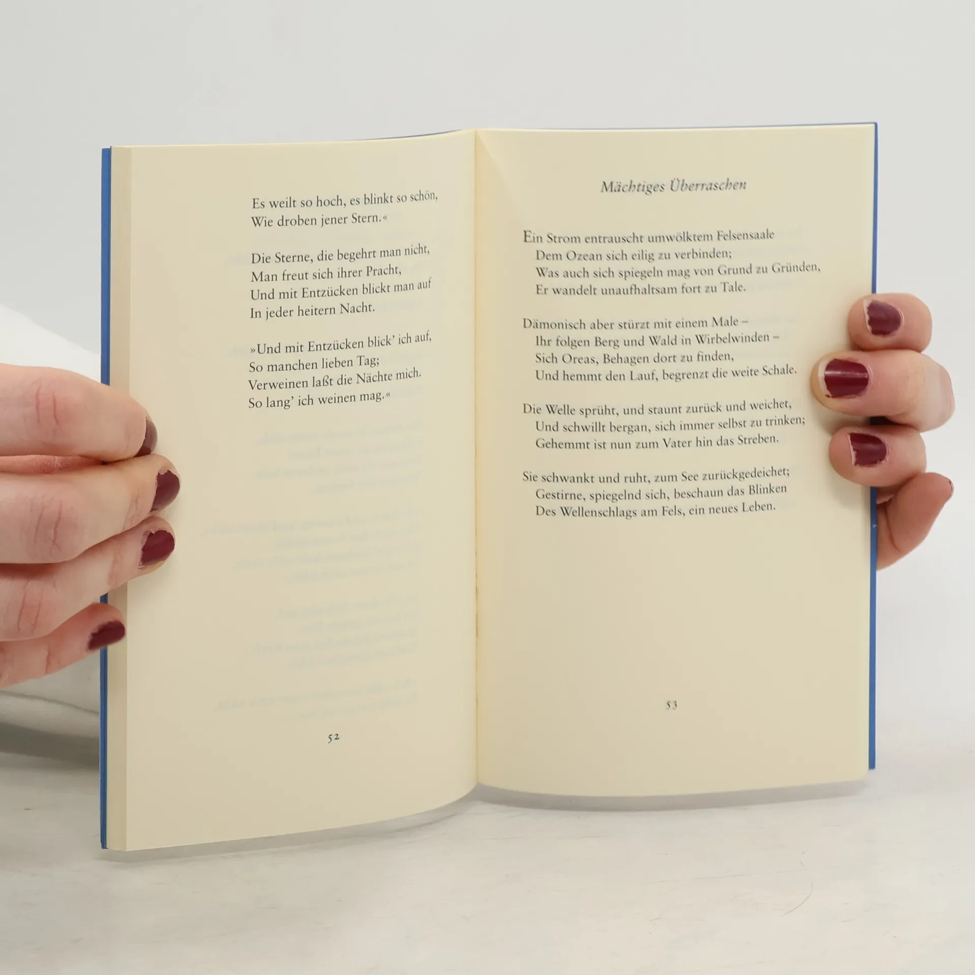 Wie kein anderer Dichter sprach Goethe sein ganzes Leben lang auf immer neue und immer ursprüngliche Weise von der Liebe. Seine Liebesgedichte sind unvergleichlich. Willkommen und Abschied Mir schlug das Herz; geschwind zu Pferde, Und fort, wild, wie ein Held zur Schlacht! Der Abend wiegte schon die Erde, Und an den Bergen hing die Nacht; Schon stund im Nebelkleid die Eiche, Ein aufgetürmte Riese, da, Wo Finsternis aus dem Gesträuche Mit hundert schwarzen Augen sah. Der Mond von seinem Wolkenhügel, Schien kläglich aus dem Duft hervor; Die Winde schwangen leise Flügel, Umsausten schauerlich mein Ohr; Die Nacht schuf tausend Ungeheuer– Doch tausendfacher war mein Mut; Mein Geist war ein verzehrend Feuer, Mein ganzes Herz zerfloß in Glut. Ich sah dich, und die milde Freude Floß aus dem süßen Blick auf mich. Ganz war mein Herz an deiner Seite, Und jeder Atemzug für dich. Ein rosenfarbes Frühlings Wetter Lag auf dem lieblichen Gesicht, Und Zärtlichkeit für mich, ihr Götter! Und hofft' es, ich verdient' es nicht. Der Abschied, wie bedrängt, wie trübe! Aus deinen Blicken sprach dein Herz. In deinen Küssen, welche Liebe, O welche Wonne, welcher Schmerz! Du gingst, ich stund, und sah zur Erden, Und sah dir nach mit nassem Blick; Und doch, welch Glück! geliebt zu werden, Und lieben, Götter, welch ein Glück. Zu weiteren Gedichten in diesem Band »