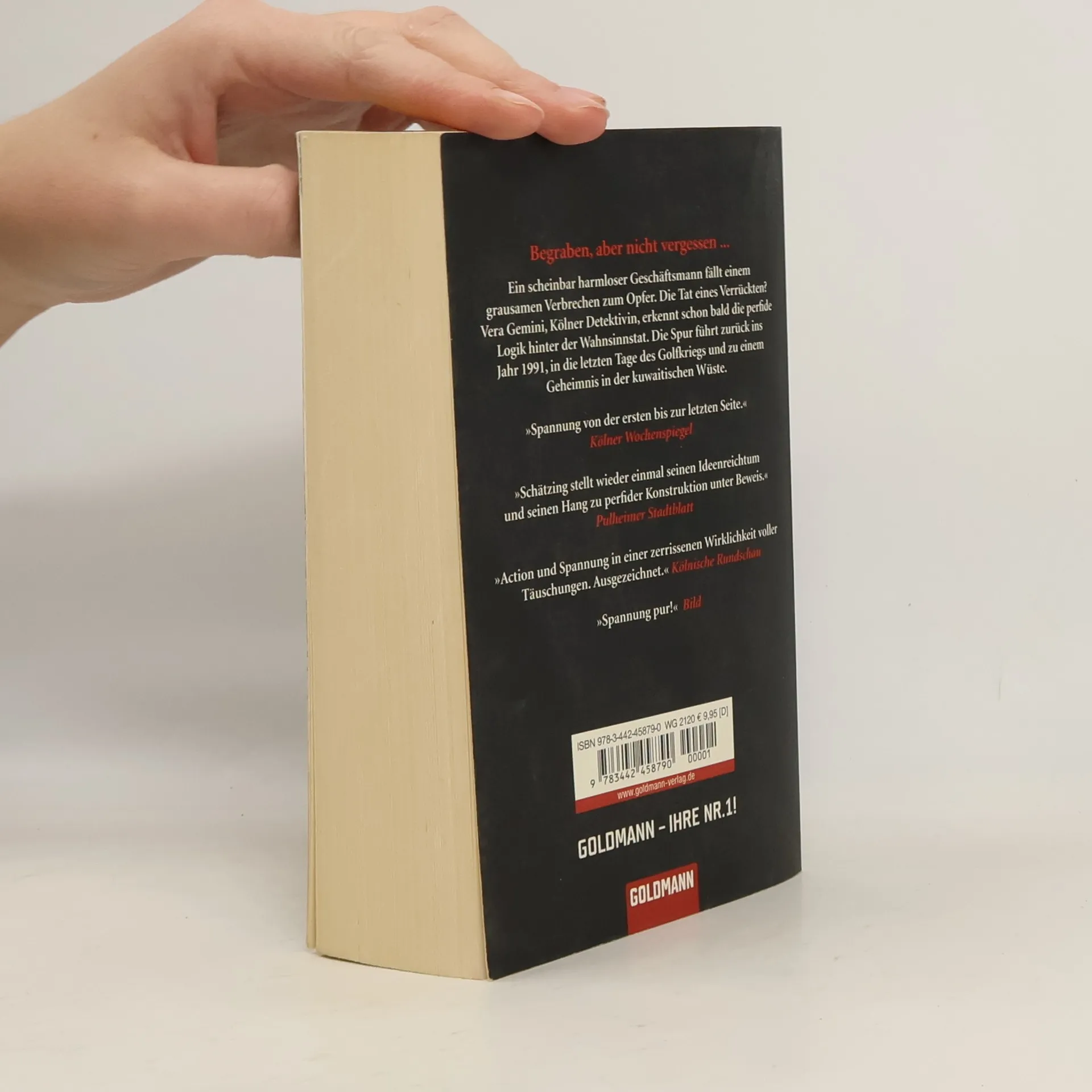 Köln 1999: Ein scheinbar harmloser Geschäftsmann fällt einem grausamen Verbrechen zum Opfer. Die Tat eines Verrückten? Vera Gemini, Kölner Detektivin, die wider Willen in den Fall hineingezogen wird, erkennt schon bald die perfide Logik hinter der angeblichen Wahnsinnstat. Die Spur führt zurück ins Jahr 1991, in die letzten Tage des Golfkriegs und zu einem Geheimnis in der kuwaitischen Wüste – begraben, aber nicht vergessen …