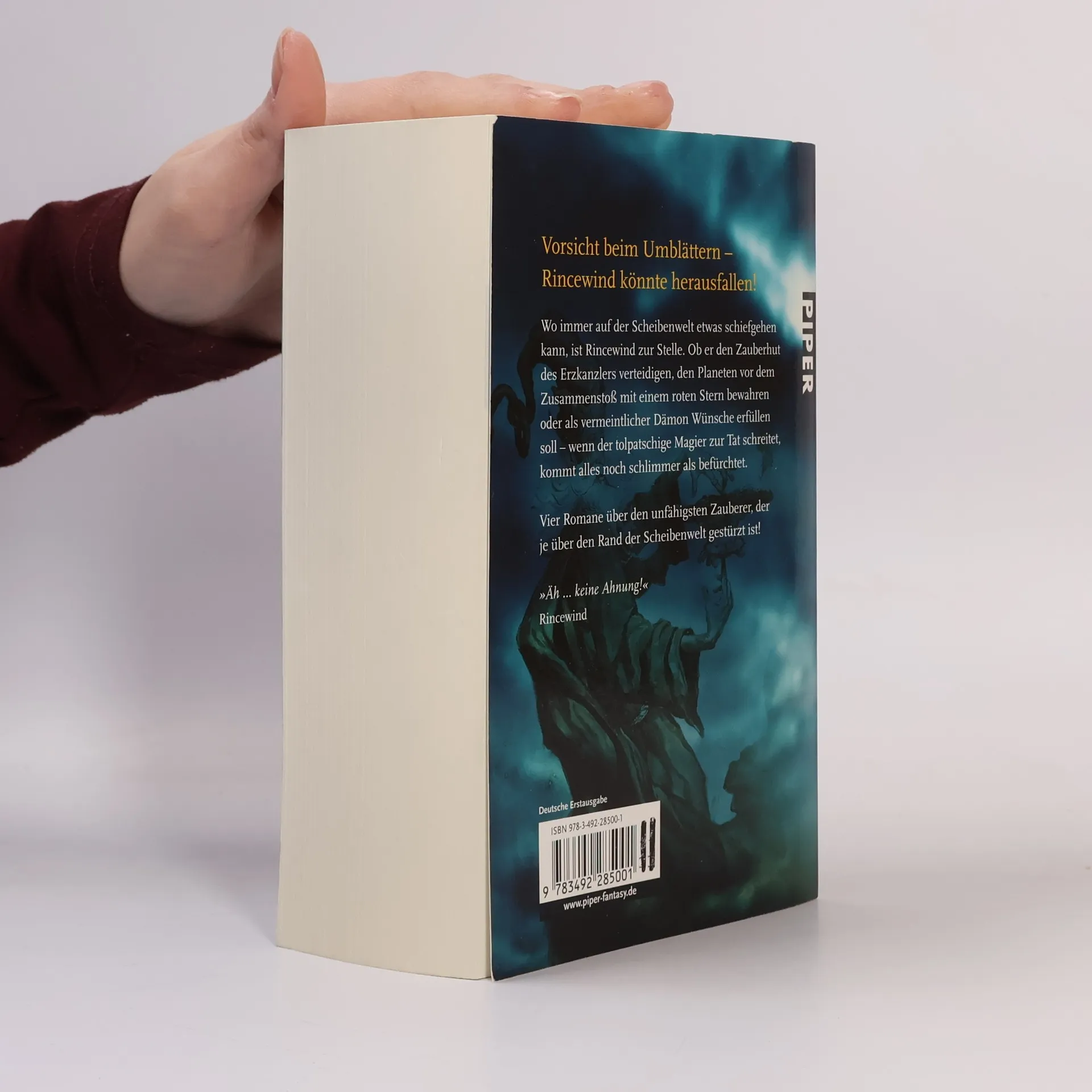 Der tollpatschigste Scheibenwelt-Sammelband aller Zeiten: Vorsicht beim Umblättern, Rincewind könnte herausfallen! Jeder, der mit dem chaotischen Zauberer Rincewind zu tun hatte, wünscht sich, einmal mit Profis zu arbeiten. In diesem Sammelband wird der gescheiterte Zauberer durch vier große Abenteuer geschickt. Seine Biografie? Fragwürdig. Seine magischen Talente? Unruhe stiften. Seine Geschichte? Unfassbar witzig! Rincewind gehört zu den schillerndsten Figuren in Terry Pratchetts Fantasy-Reihe und erfreut sich großer Beliebtheit. Die vier wichtigsten Abenteuer sind vereint: »Die Farben der Magie«, »Das Licht der Phantasie«, »Der Zauberhut« und »Eric«. »Die Farben der Magie« ist der Auftakt der Zauberer-Geschichten und gleichzeitig der erste Band der Scheibenwelt-Reihe, auf die die drei weiteren Erzählungen direkt aufbauen. Dieser Sammelband ist somit der perfekte Einstieg in die Scheibenwelt-Fantasy. Wie es sich trotz totaler Ahnungslosigkeit als Held unzähliger großartiger Geschichten lebt, erkunden Sie hier auf preisgünstige Weise. Terry Pratchetts 41 Scheibenwelt-Romane sind unerreichte Klassiker der humorvollen Fantasy und ein beispielloser internationaler Erfolg. Bei seinem Tod 2015 standen die Verkaufszahlen bei rund 45 Millionen Büchern, und täglich kommen neue Fans hinzu.