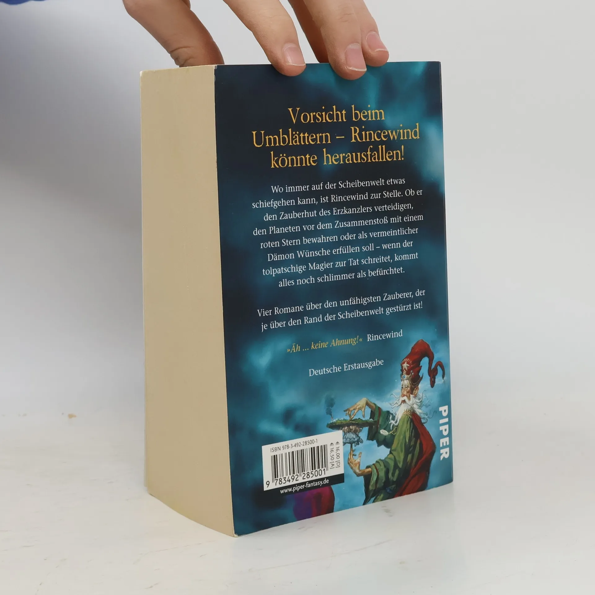 Der tollpatschigste Scheibenwelt-Sammelband aller Zeiten: Vorsicht beim Umblättern, Rincewind könnte herausfallen! Jeder, der mit dem chaotischen Zauberer Rincewind zu tun hatte, wünscht sich, einmal mit Profis zu arbeiten. In diesem Sammelband wird der gescheiterte Zauberer durch vier große Abenteuer geschickt. Seine Biografie? Fragwürdig. Seine magischen Talente? Unruhe stiften. Seine Geschichte? Unfassbar witzig! Rincewind gehört zu den schillerndsten Figuren in Terry Pratchetts Fantasy-Reihe und erfreut sich großer Beliebtheit. Die vier wichtigsten Abenteuer sind vereint: »Die Farben der Magie«, »Das Licht der Phantasie«, »Der Zauberhut« und »Eric«. »Die Farben der Magie« ist der Auftakt der Zauberer-Geschichten und gleichzeitig der erste Band der Scheibenwelt-Reihe, auf die die drei weiteren Erzählungen direkt aufbauen. Dieser Sammelband ist somit der perfekte Einstieg in die Scheibenwelt-Fantasy. Wie es sich trotz totaler Ahnungslosigkeit als Held unzähliger großartiger Geschichten lebt, erkunden Sie hier auf preisgünstige Weise. Terry Pratchetts 41 Scheibenwelt-Romane sind unerreichte Klassiker der humorvollen Fantasy und ein beispielloser internationaler Erfolg. Bei seinem Tod 2015 standen die Verkaufszahlen bei rund 45 Millionen Büchern, und täglich kommen neue Fans hinzu.