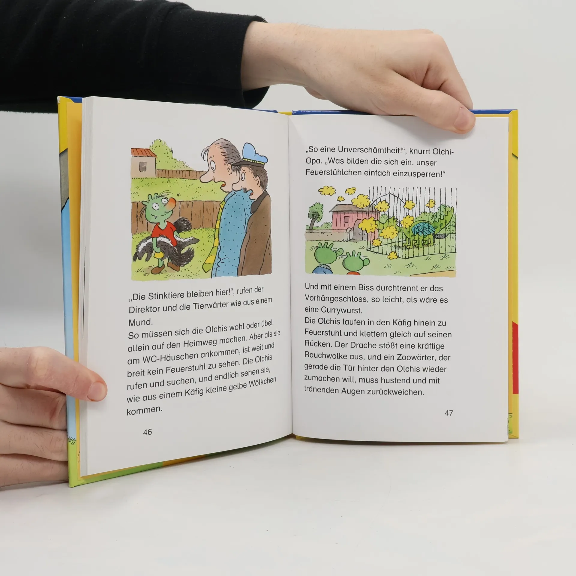 „Schlabber-Kröten-Furz! Ihr habt ja wohl gar keine Ahnung“, raunzt der Olchi-Opa. Denn die Olchi-Kinder wissen nicht einmal, was ein Elefant ist. Das kann auch ein Olchi nicht durchgehen lassen und deshalb machen Olchi-Oma und Olchi-Opa mit den Olchi-Kindern einen Ausflug in den Zoo. Und das kann ja nur im Chaos enden.
