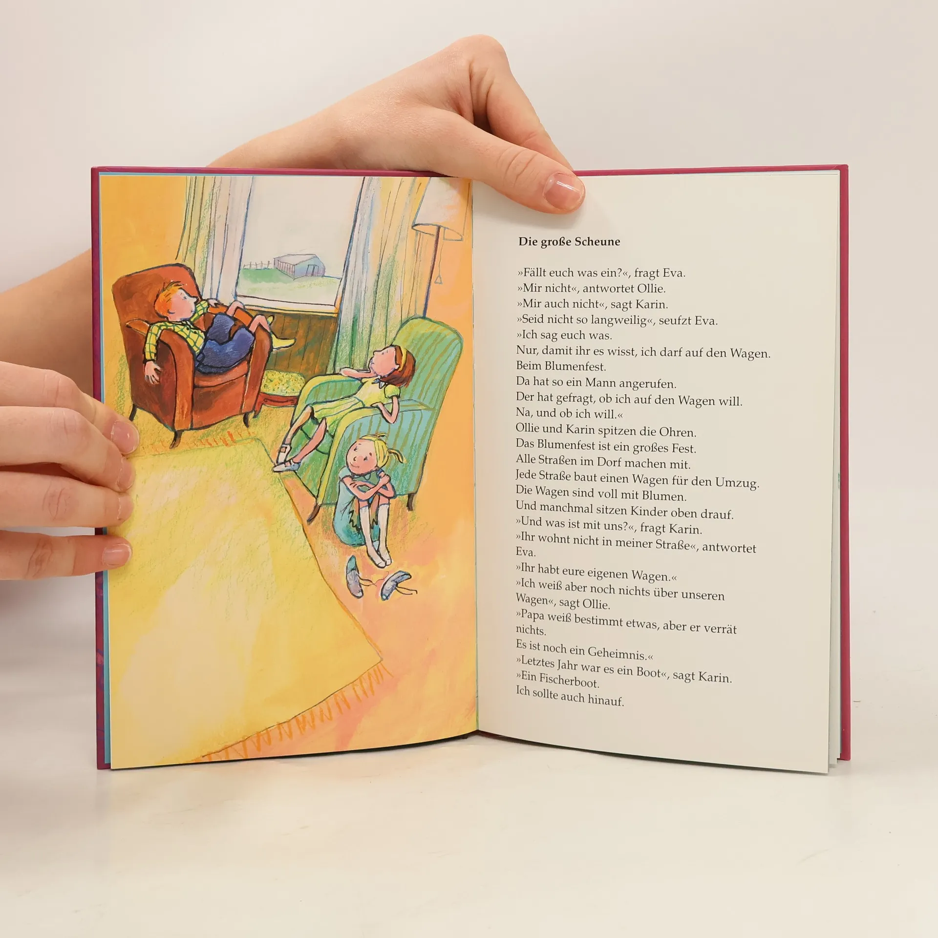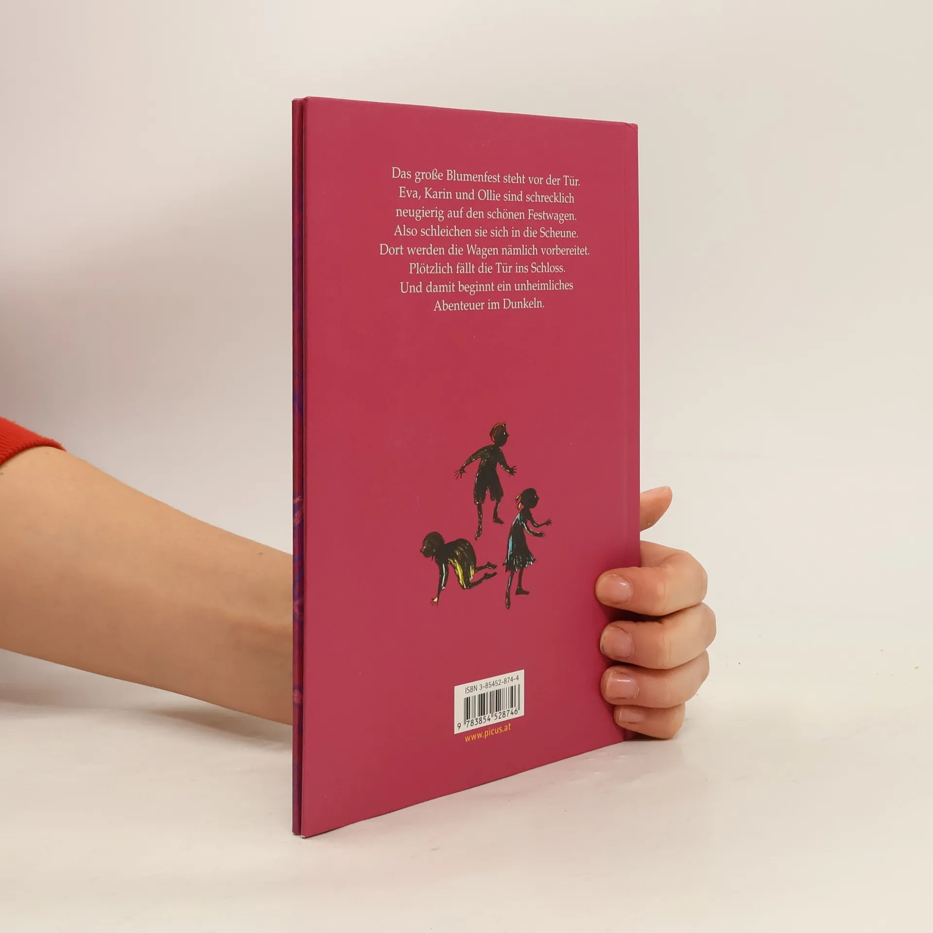 Das große Blumenfest steht vor der Tür. Eva, Karin und Ollie sind schrecklich neugierig auf den schönen Festwagen. Also schleichen sie sich in die Scheune. Dort werden die Wagen nämlich vorbereitet. Plötzlich fällt die Tür ins Schloss. Und damit beginnt ein unheimliches Abenteuer im Dunkeln
