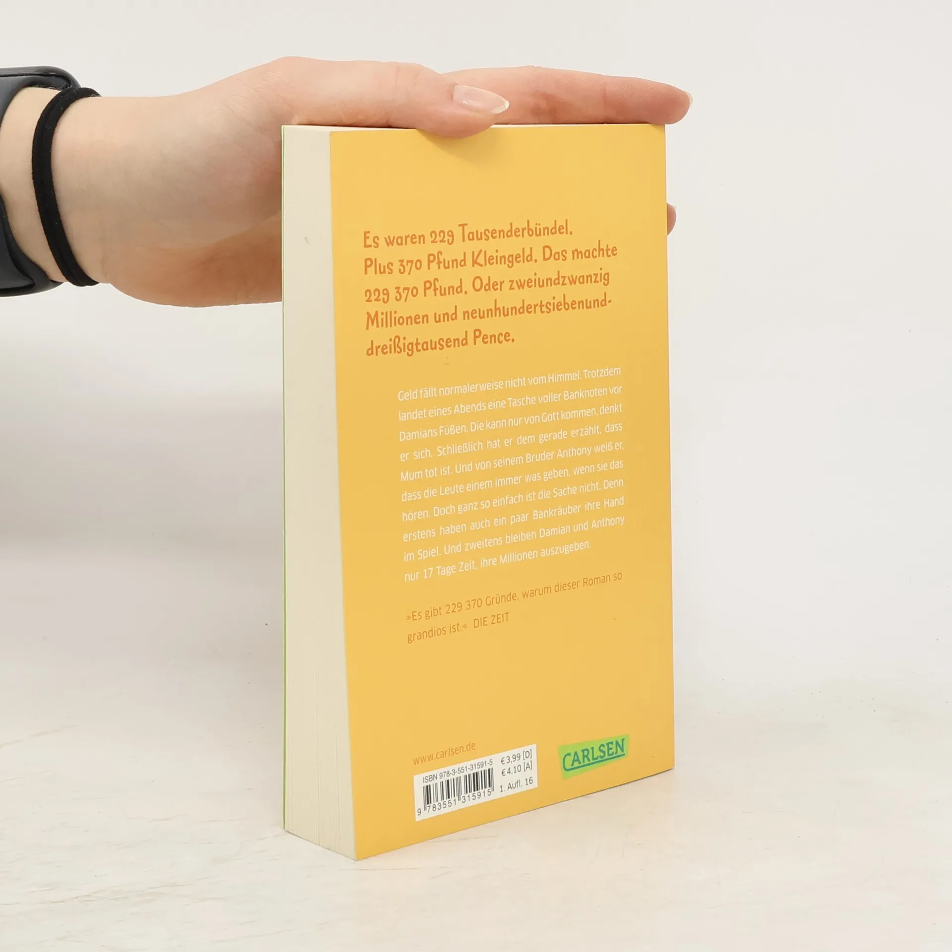 Zugegebenermaßen passiert es eher selten, dass Geld vom Himmel fällt. Doch eines Abends landen Millionen von Pfund vor Damians Füßen. Um genau zu sein: zweiundzwanzig Millionen und neunhundertsiebenunddreißigtausend Pence. Damian glaubt, dass das Geld nur von Gott sein kann. Schließlich hat er dem gerade erzählt, dass Mum tot ist. Und von seinem großen Bruder Anthony weiß er, dass die Leute dir immer was geben, wenn du ihnen das erzählst. Außerdem, wer sonst hätte so einen Haufen Geld? Aber es ist nicht nur erquicklich, so reich zu sein, denn die beiden Brüder haben nur 17 Tage Zeit, um das Geld auszugeben. Und damit fangen die Schwierigkeiten erst an.