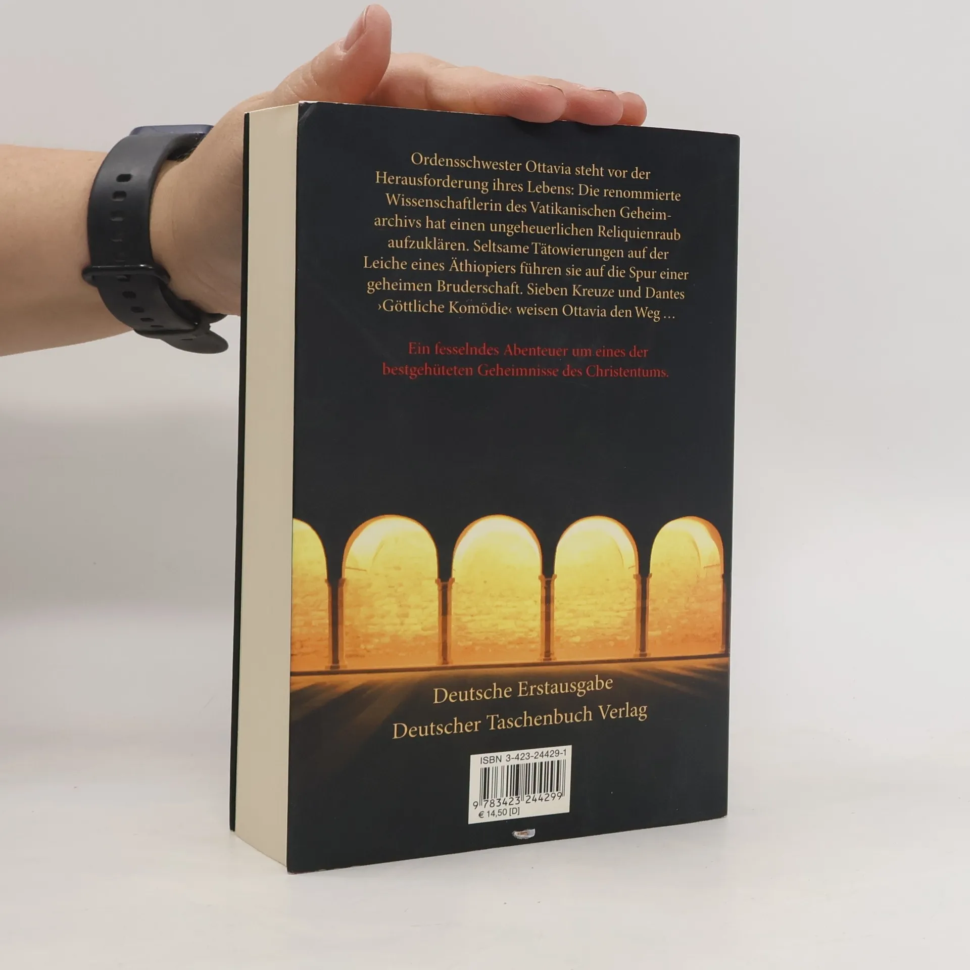 Sieben Zeichen, sieben Städte und eine mysteriöse Bruderschaft: ein spannungsgeladener Abenteuerroman. Der Bestseller aus Spanien! Seltsame Tätowierungen zieren die Leiche eines Äthiopiers. Als Ottavia Salina völlig überraschend zum mächtigsten Mann des Kirchenstaats, Kardinal Sodano, gerufen wird, ahnt sie nicht, was sie erwartet: Die renommierte Paläographin des Vatikanischen Geheimarchivs wird beauftragt, die geheimnisvollen Kreuze und Buchstaben auf dem Toten zu entschlüsseln. Gemeinsam mit dem undurchschaubaren Hauptmann Glauser-Röist von der Schweizergarde und Farag Boswell, einem koptischen Archäologen aus Alexandria, macht sich Ottavia Salina auf die Suche nach den Reliquienräubern. Sieben Prüfungen auf Leben und Tod hat das kuriose Detektivtrio zu bestehen, die um Dantes ›Göttliche Komödie‹ und die sieben Todsünden kreisen. Diese sieben Prüfungen führen sie auch in die sieben historischen Hauptstädte des Christentums: nach Rom, Ravenna, Athen, Jerusalem, Konstantinopel, Alexandria und Antiochia. Ein fesselnder Abenteuerroman um die bestgehüteten Geheimnisse des Christentums.