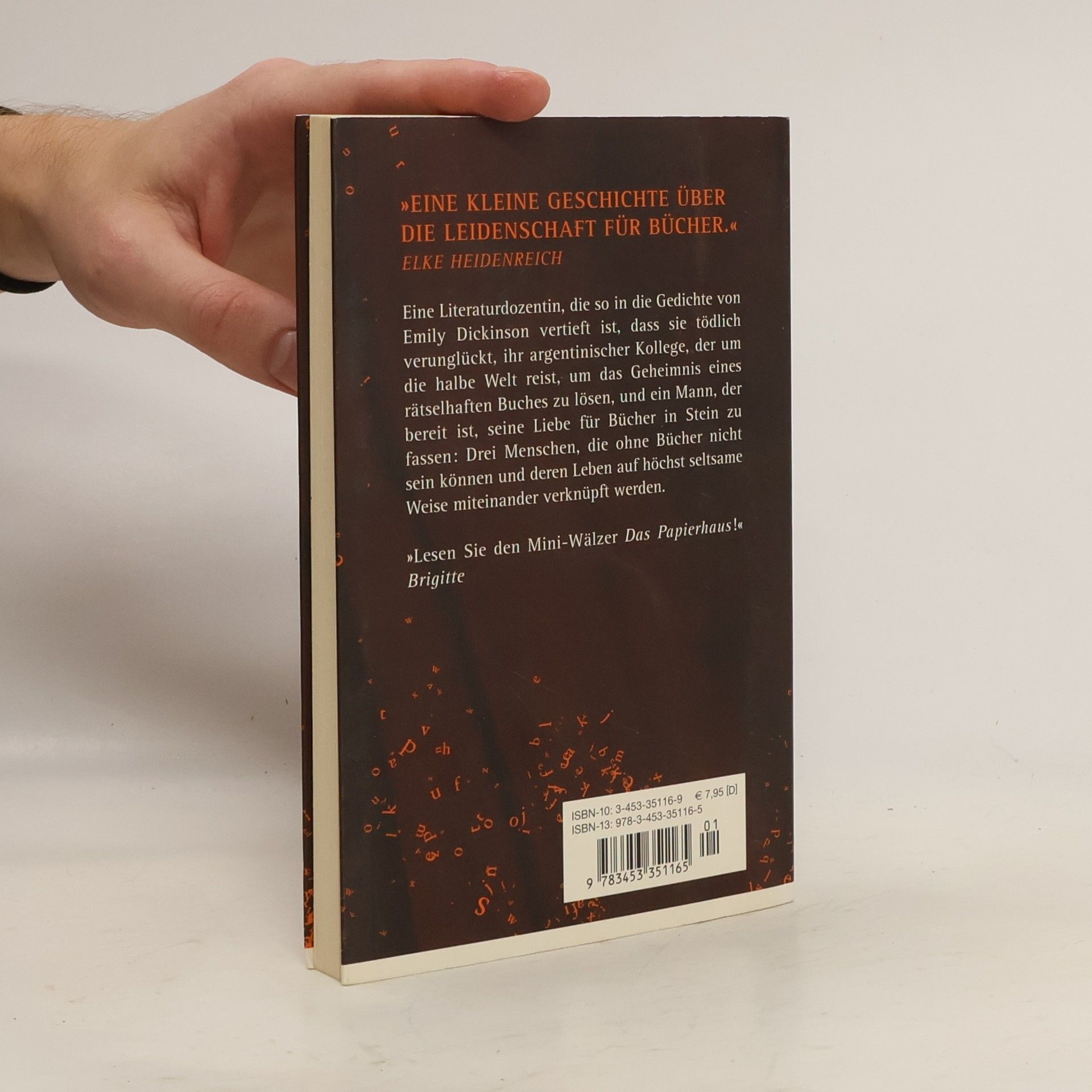 Eine Literaturdozentin, die so in die Gedichte von Emily Dickinson vertieft ist, dass sie tödlich verunglückt, ihr argentinischer Kollege, der um die halbe Welt reist, um das Geheimnis eines rätselhaften Buches zu lösen, und ein Mann, der bereit ist, seine Liebe für Bücher in Stein zu fassen: drei Menschen, die ohne Bücher nicht sein können und deren Leben auf höchst seltsame Weise miteinander verknüpft werden.