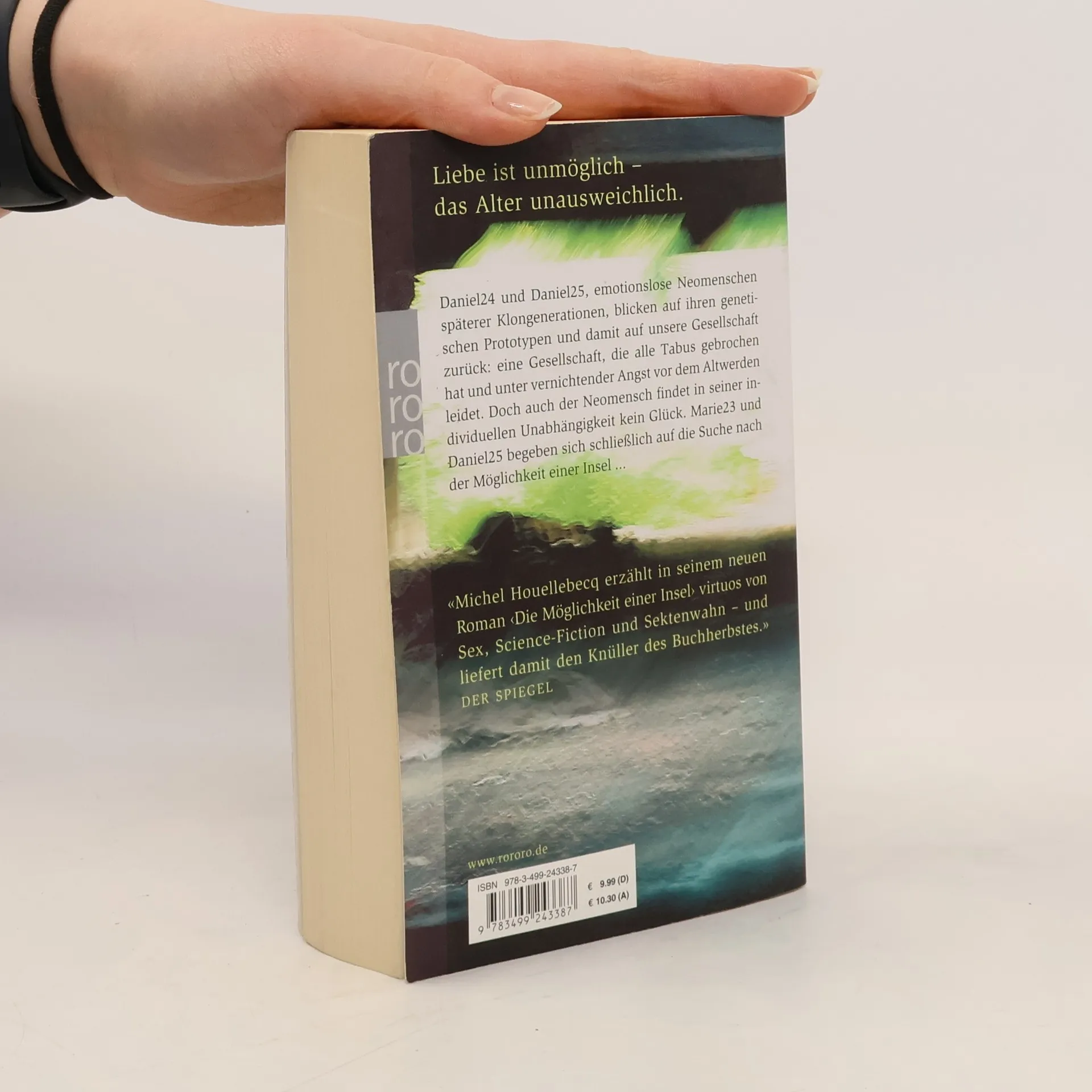 Liebe ist unmöglich – Das Alter unausweichlichDaniel24 und Daniel25, emotionslose Neomenschen späterer Klongenerationen, blicken auf ihren genetischen Prototypen und damit auf unsere Gesellschaft zurück: Eine Gesellschaft, die alle Tabus gebrochen hat und unter vernichtender Angst vor dem Altwerden leidet. Doch auch der Neomensch findet in seiner individuellen Unabhängigkeit kein Glück. Marie23 und Daniel25 begeben sich schließlich auf die Suche nach der Möglichkeit einer Insel …„Michel Houellebecq erzählt in seinem neuen Roman ‚Die Möglichkeit einer Insel’ virtuos von Sex, Science-Fiction und Sektenwahn – und liefert damit den Knüller des Buchherbstes.“ (Der Spiegel)