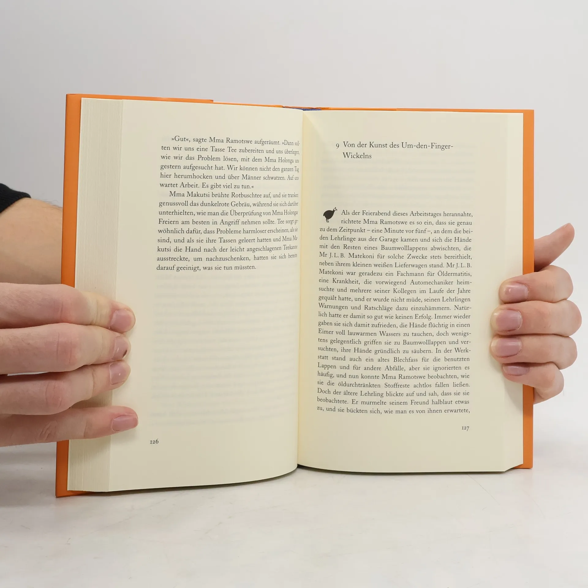 Mma Ramotswe, die liebenswürdige Privatdetektivin aus Botswana muss ihrem langjährigen Verlobten, dem Besitzer von Tlokweng Road Speedy Motors, Mr. J.L.B. Matekoni, zur Seite stehen. Als er von der Leiterin eines Waisenhauses mit dem Vorschlag überrumpelt wird, bei einer Wohltätigkeitsveranstaltung mit einem Fallschirm abzuspringen, sind ihre Menschenkenntnis und ihr Ideenreichtum gefragt. Denn der schüchterne Mr. Matekoni will sich auf gar keinen Fall vom Himmel stürzen ... Jede Zeile dieses Romans ist erfüllt von Weisheit, Poesie und feinem Humor. Alexander McCall Smith wurde für dieses Buch mit dem "Saga Award for Wit" ausgezeichnet.