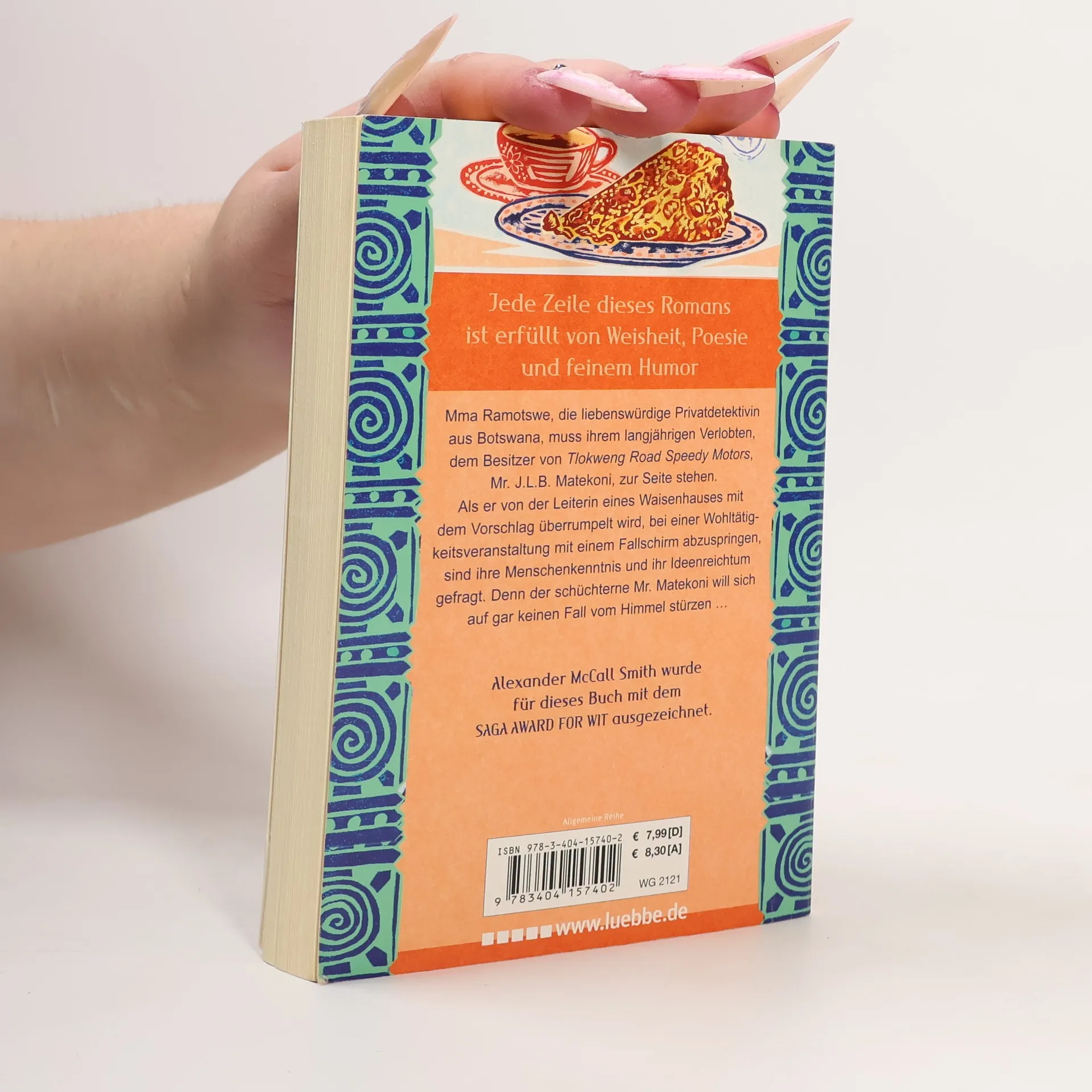 Mma Ramotswe, die liebenswürdige Privatdetektivin aus Botswana muss ihrem langjährigen Verlobten, dem Besitzer von Tlokweng Road Speedy Motors, Mr. J.L.B. Matekoni, zur Seite stehen. Als er von der Leiterin eines Waisenhauses mit dem Vorschlag überrumpelt wird, bei einer Wohltätigkeitsveranstaltung mit einem Fallschirm abzuspringen, sind ihre Menschenkenntnis und ihr Ideenreichtum gefragt. Denn der schüchterne Mr. Matekoni will sich auf gar keinen Fall vom Himmel stürzen ... Jede Zeile dieses Romans ist erfüllt von Weisheit, Poesie und feinem Humor. Alexander McCall Smith wurde für dieses Buch mit dem "Saga Award for Wit"