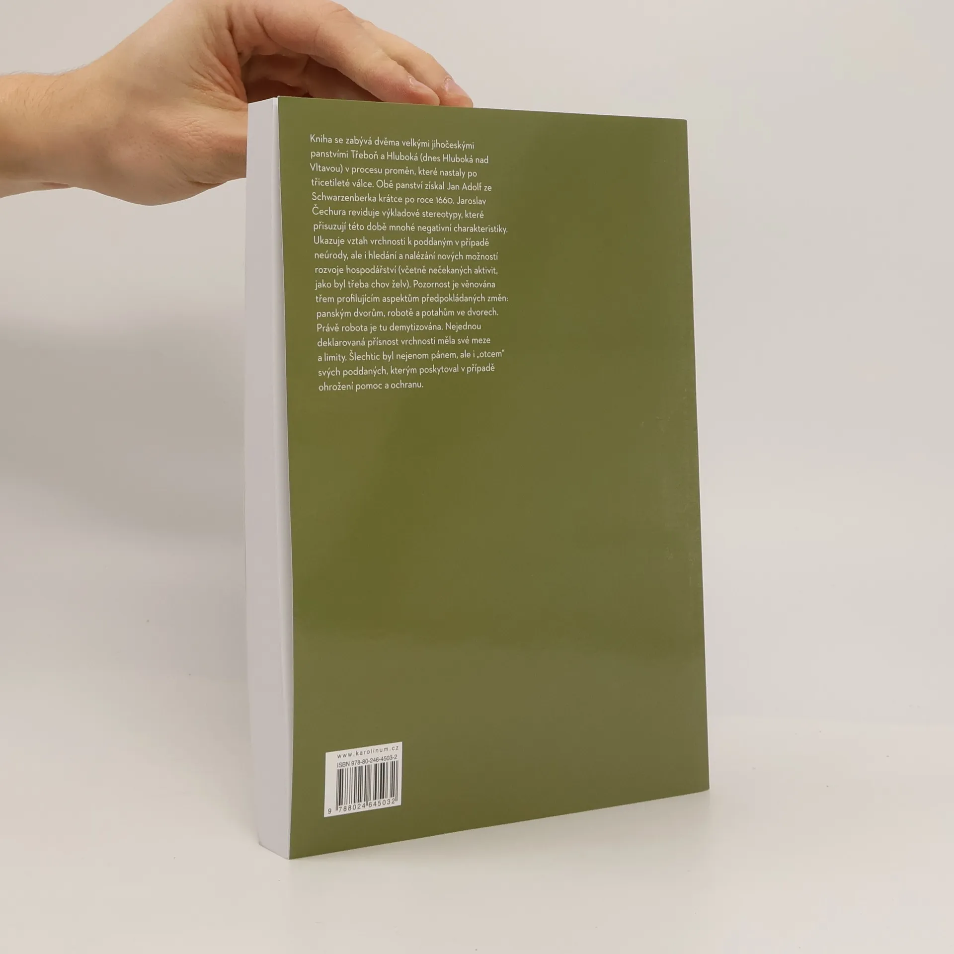 Kniha se zabývá dvěma velkými jihočeskými panstvími Třeboň a Hluboká (dnes Hluboká nad Vltavou) v procesu proměn, které nastaly po třicetileté válce. Obě panství získal Jan Adolf ze Schwarzenberka krátce po roce 1660. Jaroslav Čechura reviduje výkladové stereotypy, které přisuzují této době mnohé negativní charakteristiky. Ukazuje vztah vrchnosti k poddaným v případě neúrody, ale i hledání a nalézání nových možností rozvoje hospodářství (včetně nečekaných aktivit, jako byl třeba chov želv). Pozornost je věnována třem profilujícím aspektům předpokládaných změn: panským dvorům, robotě a potahům ve dvorech. Právě robota je tu demytizována. Nejednou deklarovaná přísnost vrchnosti měla své meze a limity. Šlechtic byl nejenom pánem, ale i „otcem“ svých poddaných, kterým poskytoval v případě ohrožení pomoc a ochranu.