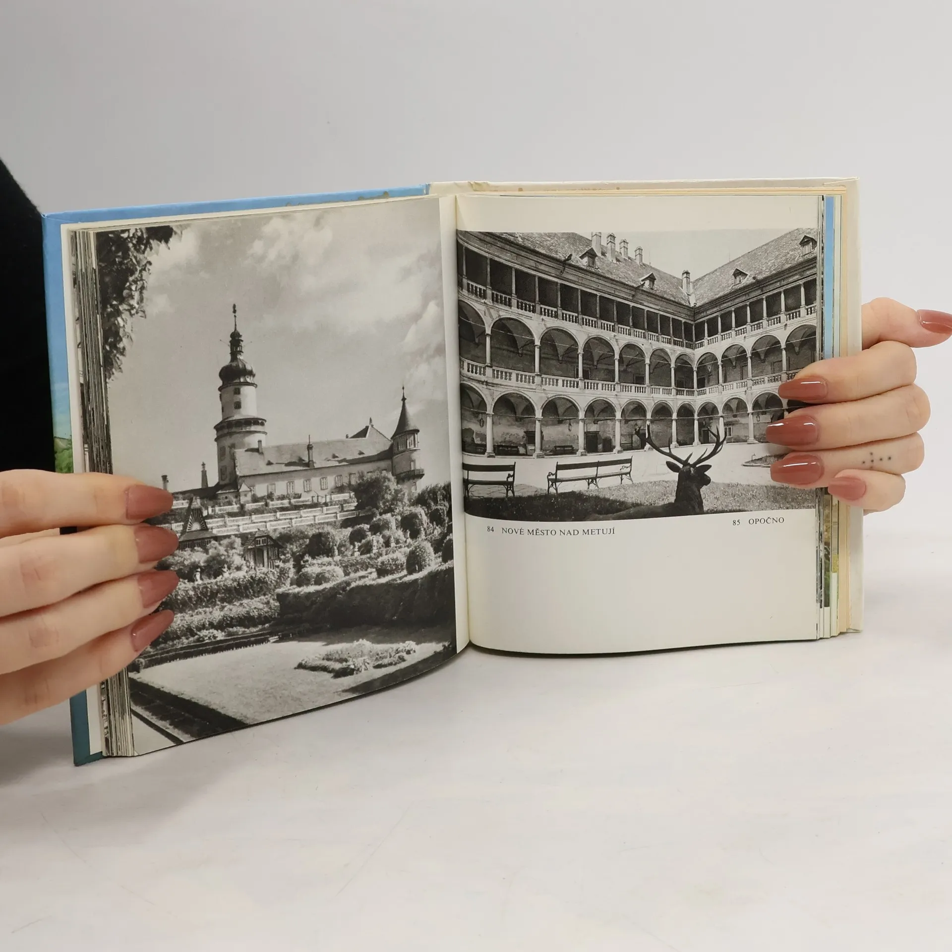 Černobílé a barevné fotografie hradů a zámků.