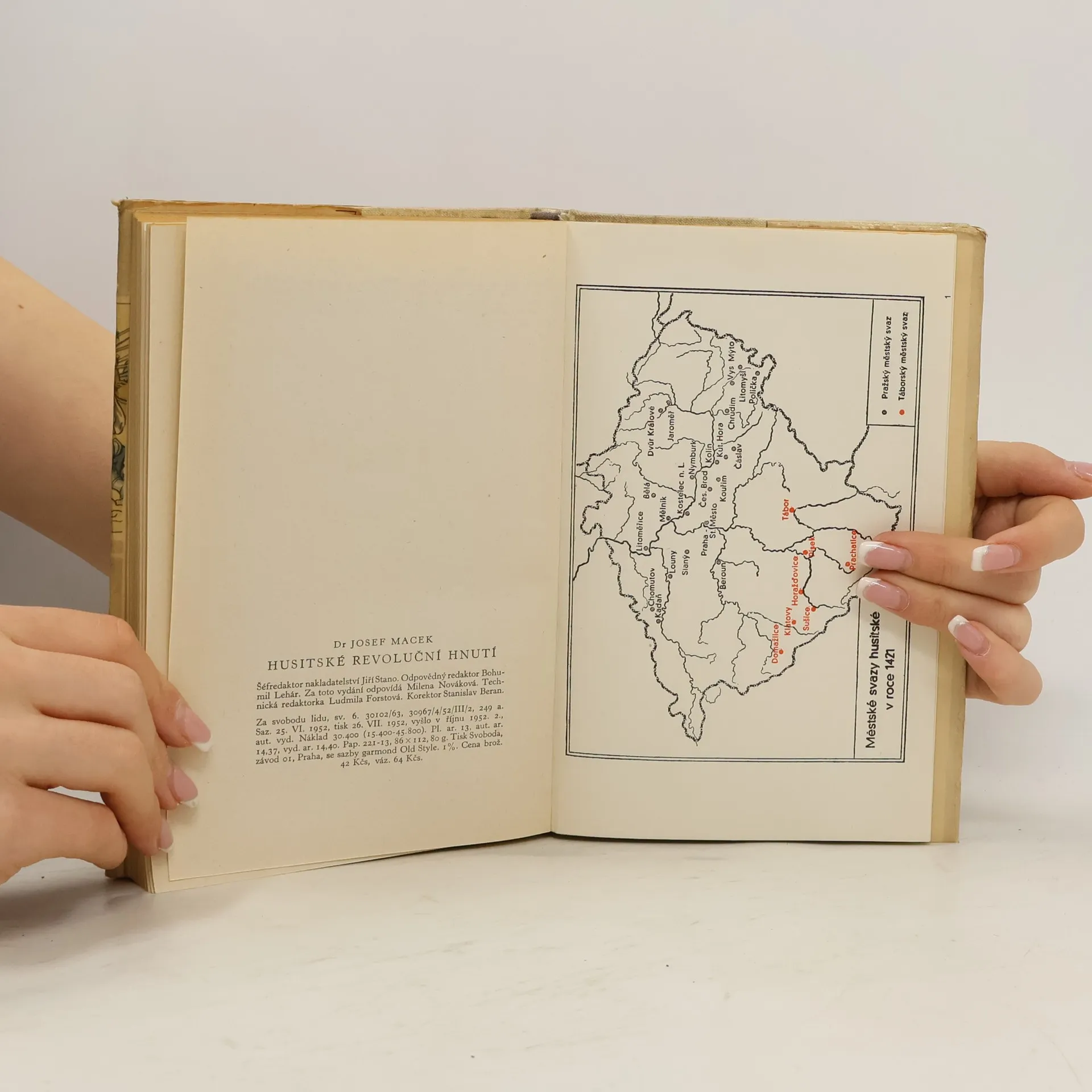 Přehledné populární vylíčení prvního čes. revolučního výbuchu proti feudalismu, k němuž vedly na poč. 15. stol. neustále se zostřující třídní rozpory za všeobecné krize feudalismu. Po rozboru hospodářsko-sociálním kniha objasňuje problémy hnutí a formování široké třídní husitské koalice, která se záhy štěpí ve 3 tábory: feudálně reakční blok, měšťanskou opozici a městskou i venkovskou chudinu. Podle třídního seskupení dělí pak hnutí v období převahy chudiny (1419-21) a převahy měšť. opozice (1421-34) v čele s vojevůdci Žižkou a Prokopem. Měšť. opozici připadl úkol organizátora a vůdce hnutí, zatím co chudina byla jeho hnací silou. Přehledně hodnotí Macek jednotlivé proudy a směry v husit. hnutí, smrt Žižkovu, nápor mezinár. reakce, slavné vítězství husitů, propagaci hnutí v cizině, jednání s koncilem o artikule, zradu domácí reakce, vytvoření panské jednoty a přípravu spiknutí k vyhlazení polních vojsk až po Lipany, skomírání hnutí a konec Roháčův. Posléze se obírá výsledky a významem hnutí, jeho ohlasem doma i v cizině a jeho zobrazením v čes. buržoazní historiografii. (Poctěno státní cenou 1952.)