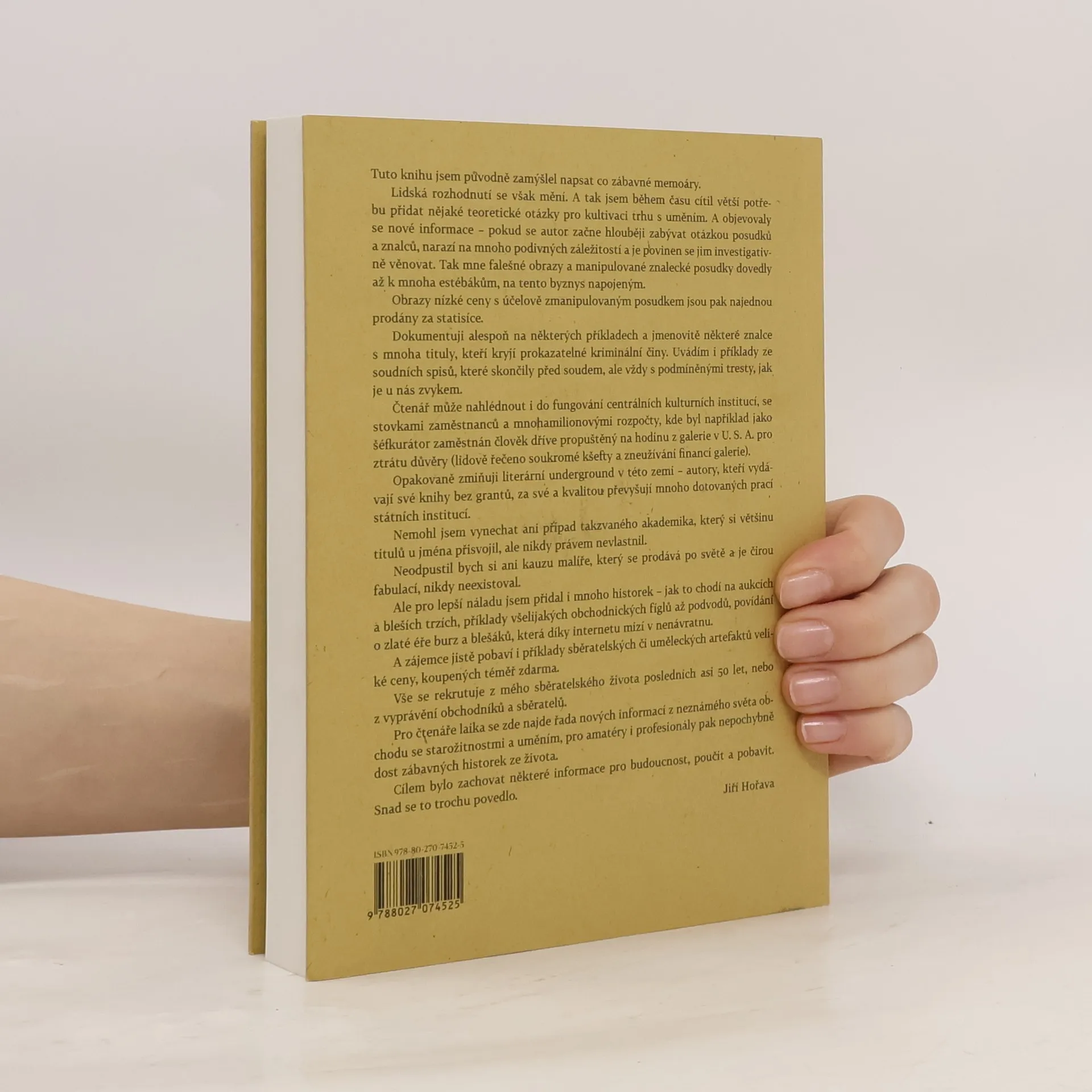 aneb rádce a průvodce trhem s uměním v ČR, veselé i smutné povídání pro začátečníky i profesionály. Vzpomínky autora na téměř půlstoletí participace na nejrůznějších aukcích, bleších trzích tu- i cizozemských a internetových dražbách po celém světě. Pro začínající obohaceno o mnoho základních údajů o nákupech a prodejích na aukcích, o trhu s uměním a starožitnostmi, základní orientaci v odborných termínech. Zvláštní pozornost je věnována posudkům ba českém trhu s uměním včetně mnoha odstrašujících příkladů. Konkrétní kauzy jsou uvedeny většinou se jmény protagonistů děje. Řada odkazů upozorňuje na odbornou literaturu včetně příkladů mnoha omylů, nesmyslů a výmyslů i v nejvyšších patrech kunsthistorické mafie. Jsou zdůrazněny minulé i přetrvávající vazby mnoha historiků umění na komunistickou Státní bezpečnost. A mimo vyjmenované se dočkáte i zábavných historek, které život přinesl.