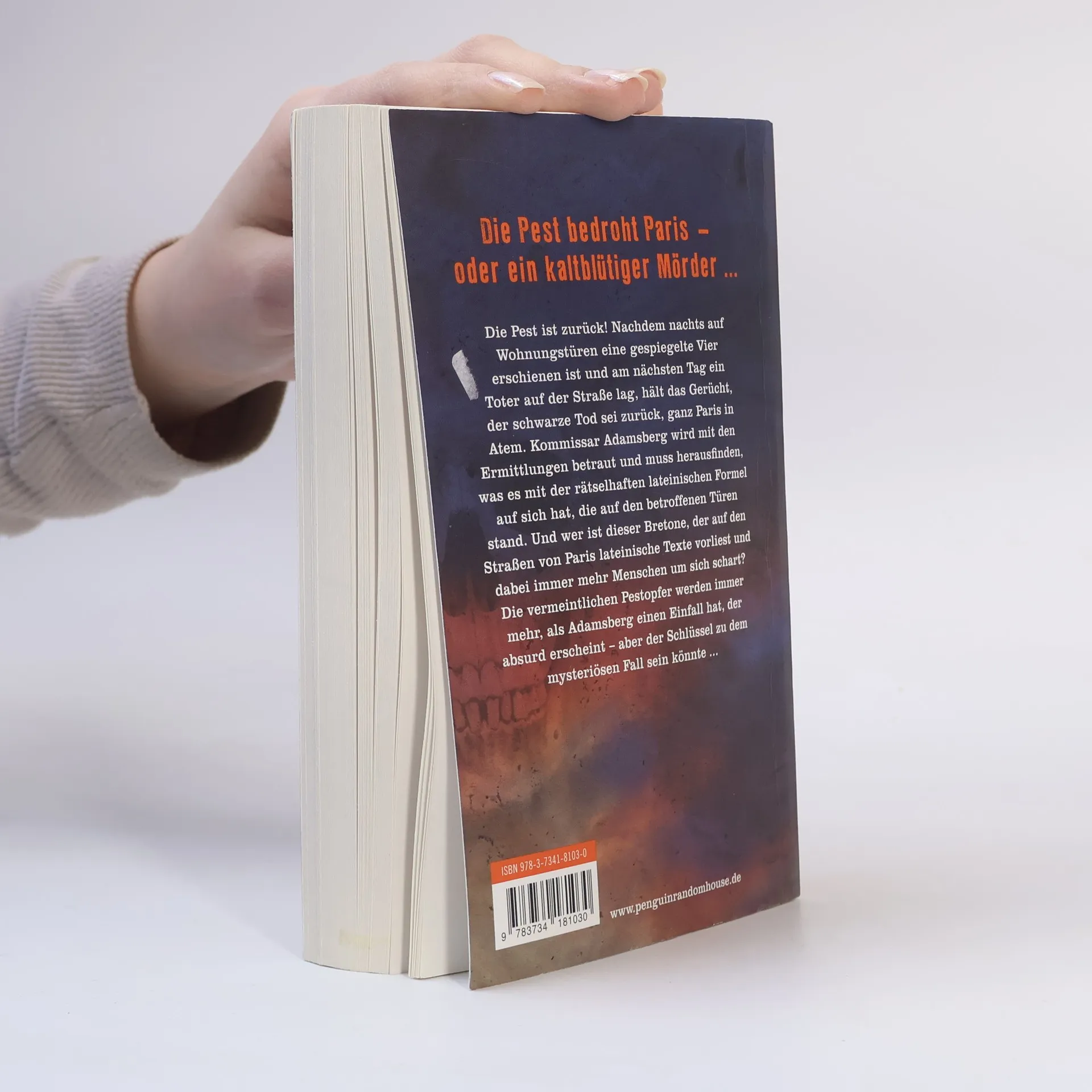 Auf den Wohnungstüren einiger Häuser im 18. Pariser Arrondissement erscheint über Nacht eine archaisch anmutende Vier. Hinter einer nicht markierten Tür liegt am Morgen ein Toter, von Flohbissen übersät und schwarz, wie die Legende von den Pesttoten des Mittelalters berichtet. Am anderen Ende der Stadt steht ein bretonischer Seemann auf einer Kiste und verliest apokalyptische Texte eines anonymen Absenders.. Die Vieren mehren sich, die Toten auch. Die Medien schüren Panik. Und Kommissar Jean-Baptiste Adamsberg steht zunächst allein mit seiner Erkenntnis, daß die Opfer nicht durch pestinfizierte Flöhe getötet wurden. Zwar findet er bald einen Verbündeten in Marc Vandoosler, einem jungen Historiker und Fachmann für das Mittelalter. Doch die Zeit drängt, der nächste Tote liegt auf dem Pariser Pflaster - schwarz ..